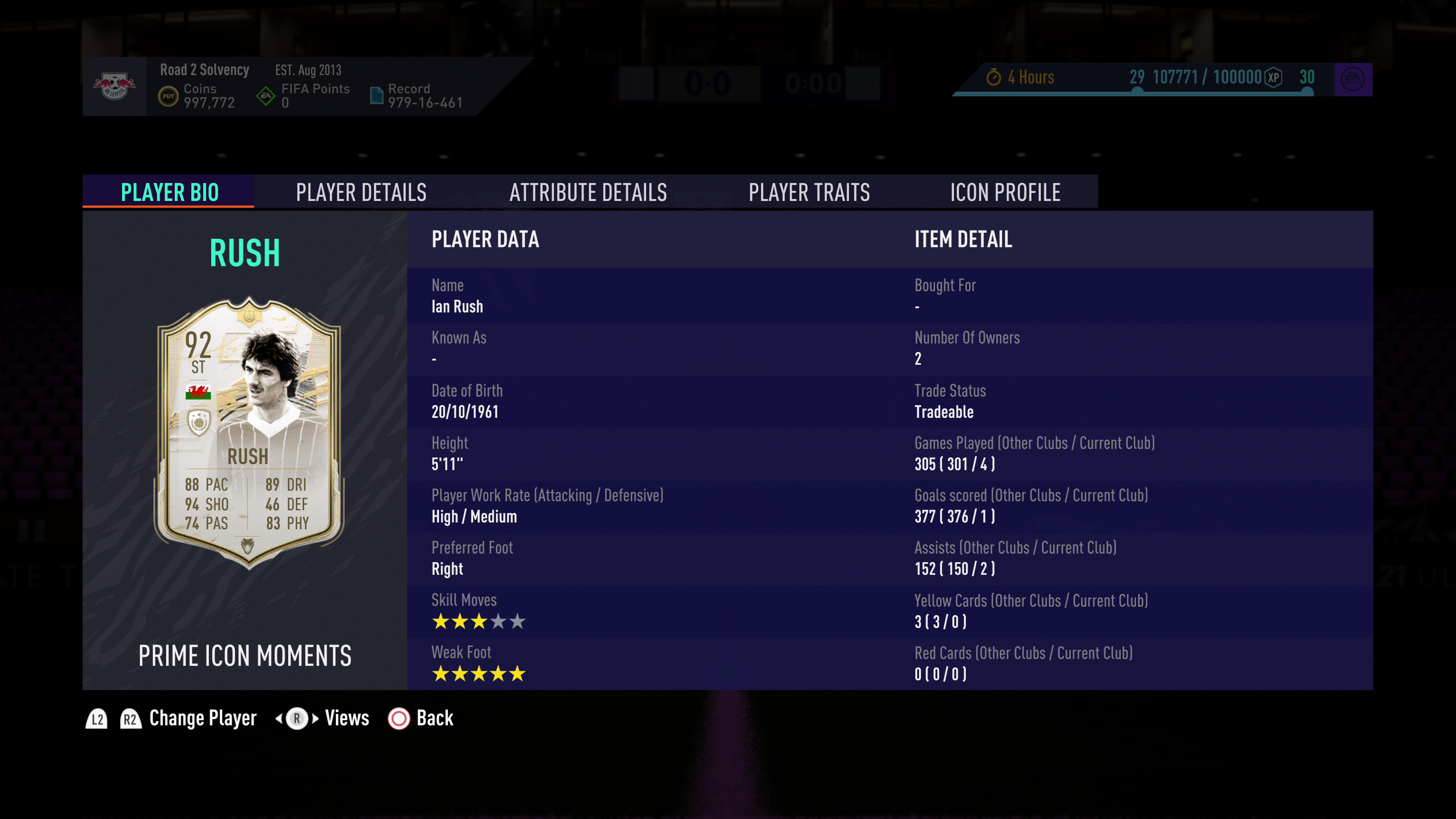 Prime Icon Moments Ian Rush is not a card that will put fear into an opponent on the loading screen, but in the right hands he absolutely should do. The Moments card is noteworthy because his weak foot was boosted to five stars (alongside three-star skills), and with a Hunter chemistry style that means he is at pretty much max pace and almost all his shooting stats are maxed to deliver rockets from either foot. Outside Foot Shot, Finesse Shot and Power Header mean he's going to pick the best possible animation in those situations, too.