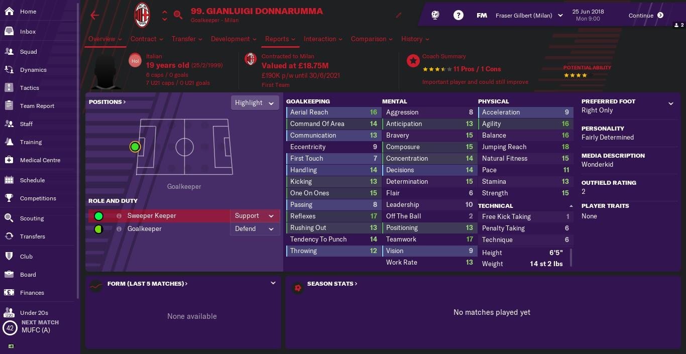 Milan's Donnarumma has already racked up over 100 appearances for the Serie A side, despite his young age. The 19-year-old Italy keeper sports a range of superb stats in Football Manager 2019, including 18 jumping reach, 17 reflexes and 17 teamwork. The game values him at just under £19m, and he’ll prove a genuine superstar for any side. He's also got bags of potential to improve further in seasons to come.