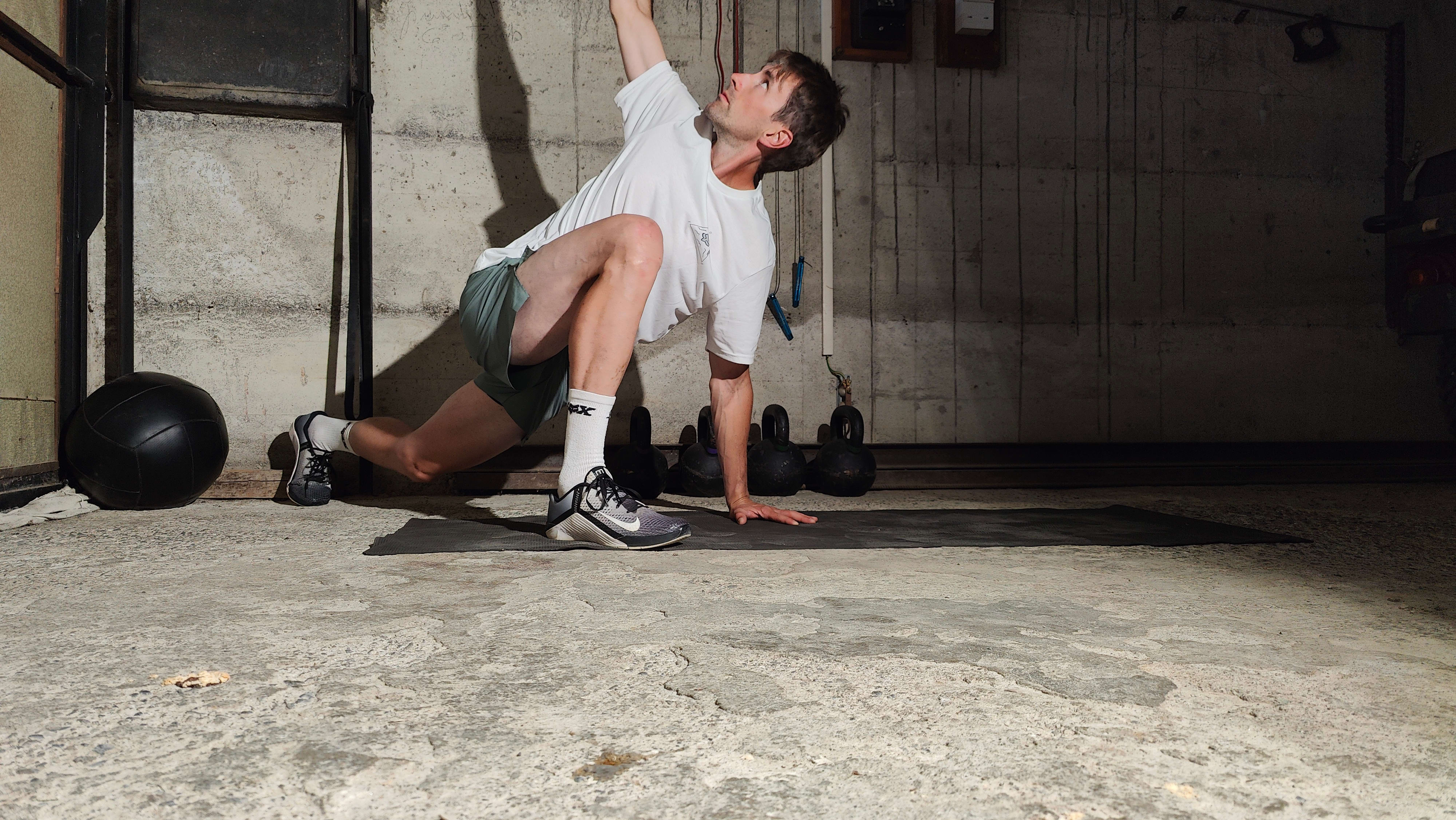 Benefits: “A slow controlled reverse lunge where you get to stretch the hip flexors. Depending on how tight your shoulders are, you also get some pretty good upper body stretches and an extra range of motion, hence why we call it the world's greatest stretch – you can basically stretch anything and everything.”