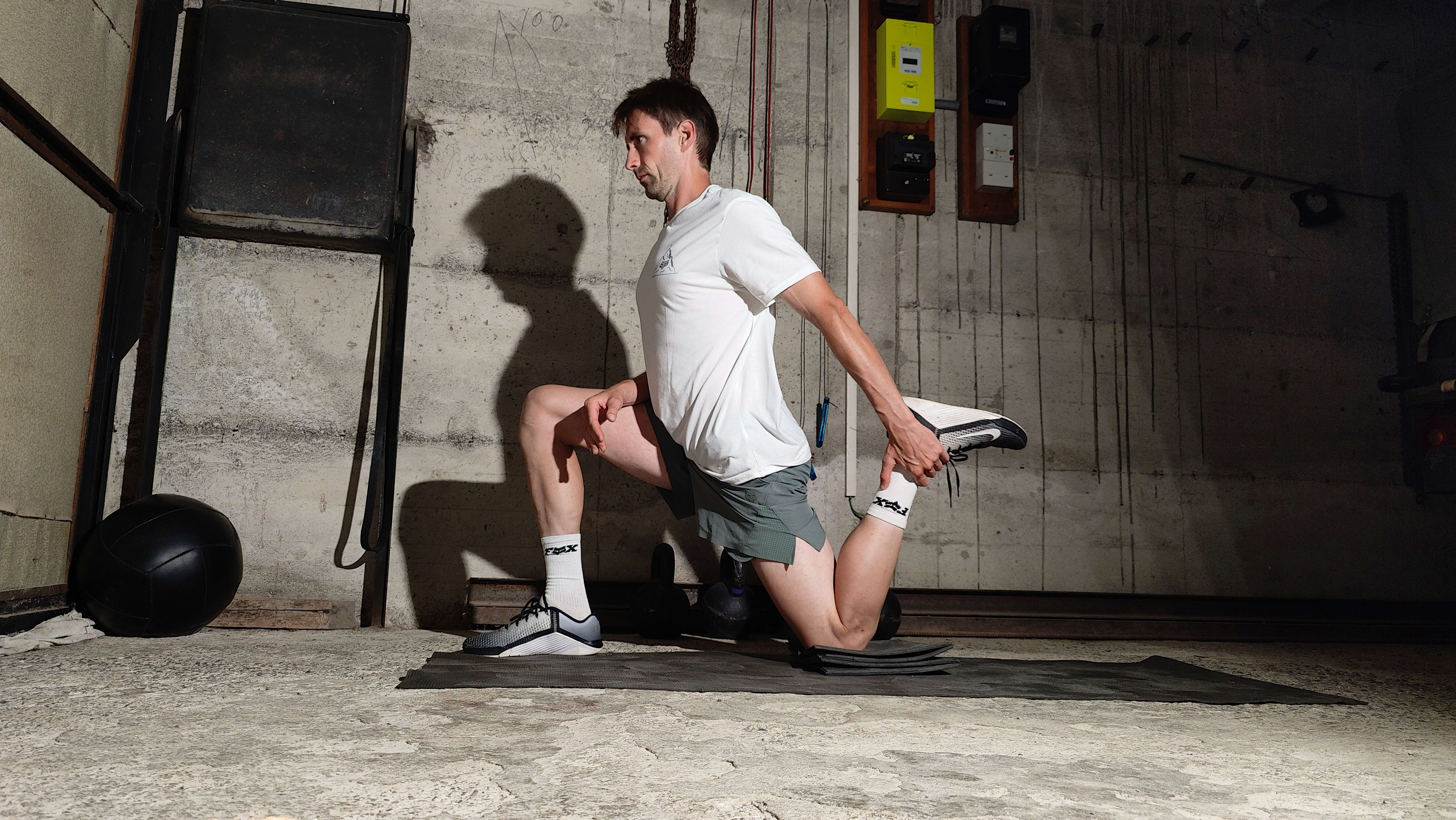 - Move your front leg as far away as necessary to feel a deep stretch right across the top of the quad into the hip flexor while still being able to hold the position somewhat comfortably.
