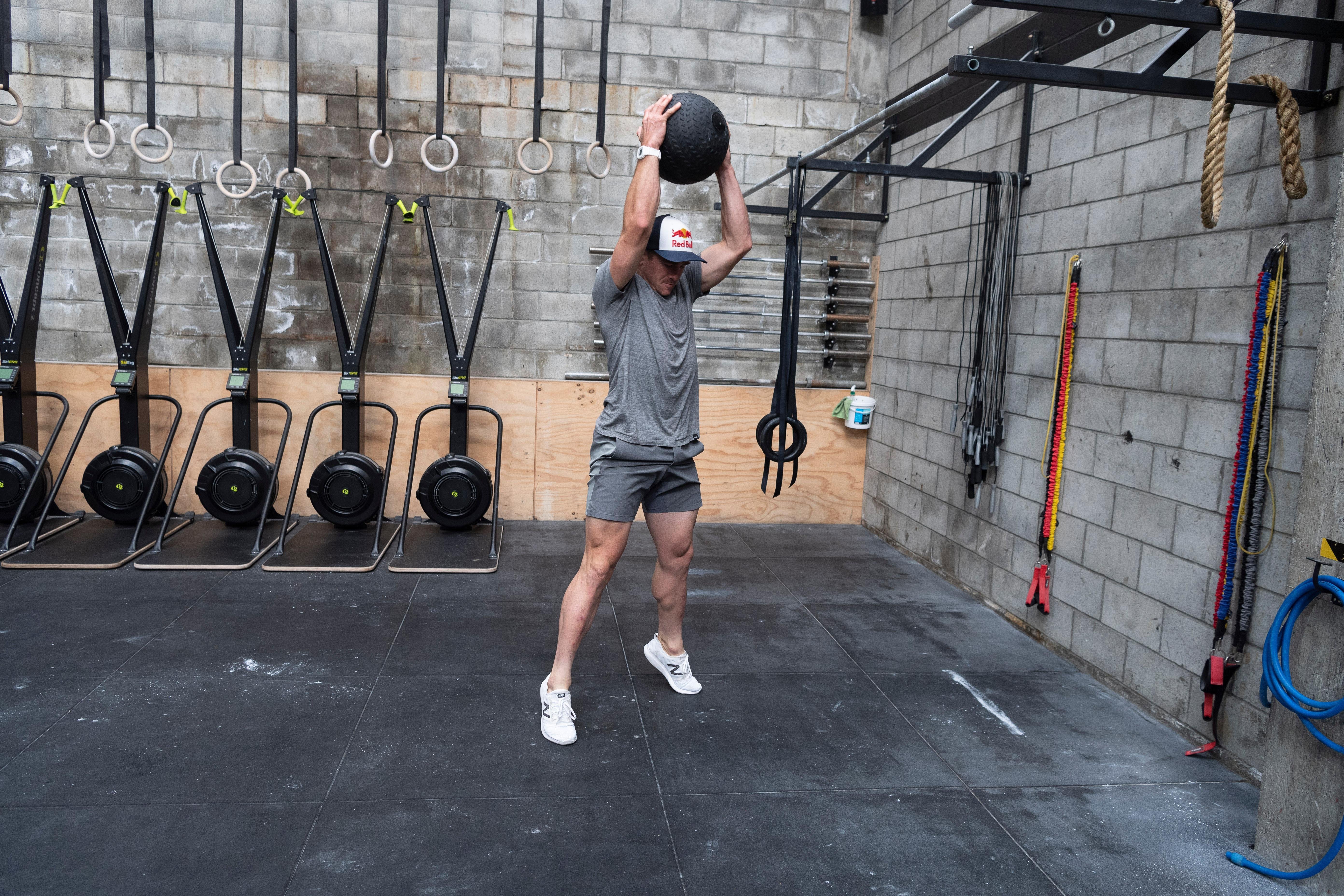 Brook Macdonald performs medicine ball slams at a gym in Wellington in April 2019.