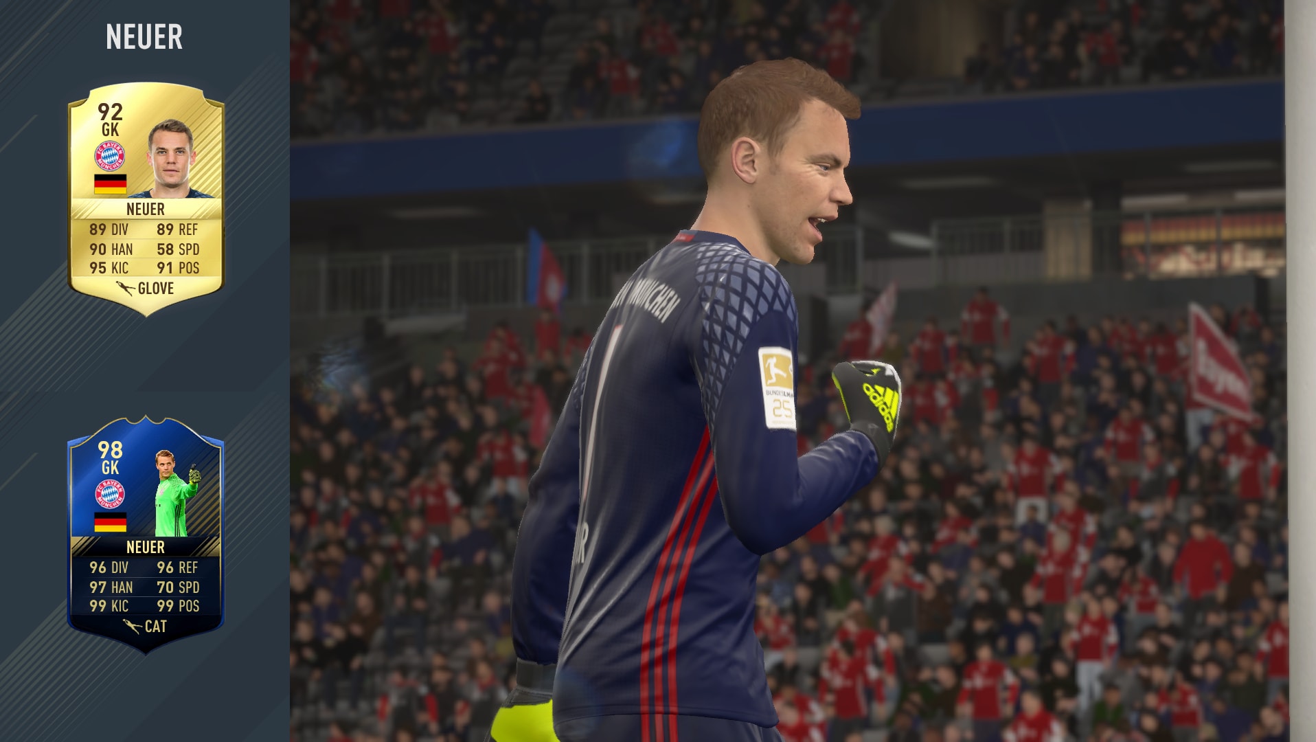 Neuer's standard card in FUT 17 is rated at 92 overall, making him the mode's best-rated non-inform keeper. If you're lucky, you might even be able to find a cheap 98 or 97-rated variant of the Bayern Munich star, awarded for Team of the Year and Team of the Season honours respectively over the course of the season. For those who pack him, expect to make around 100k from his standard card on the transfer market.