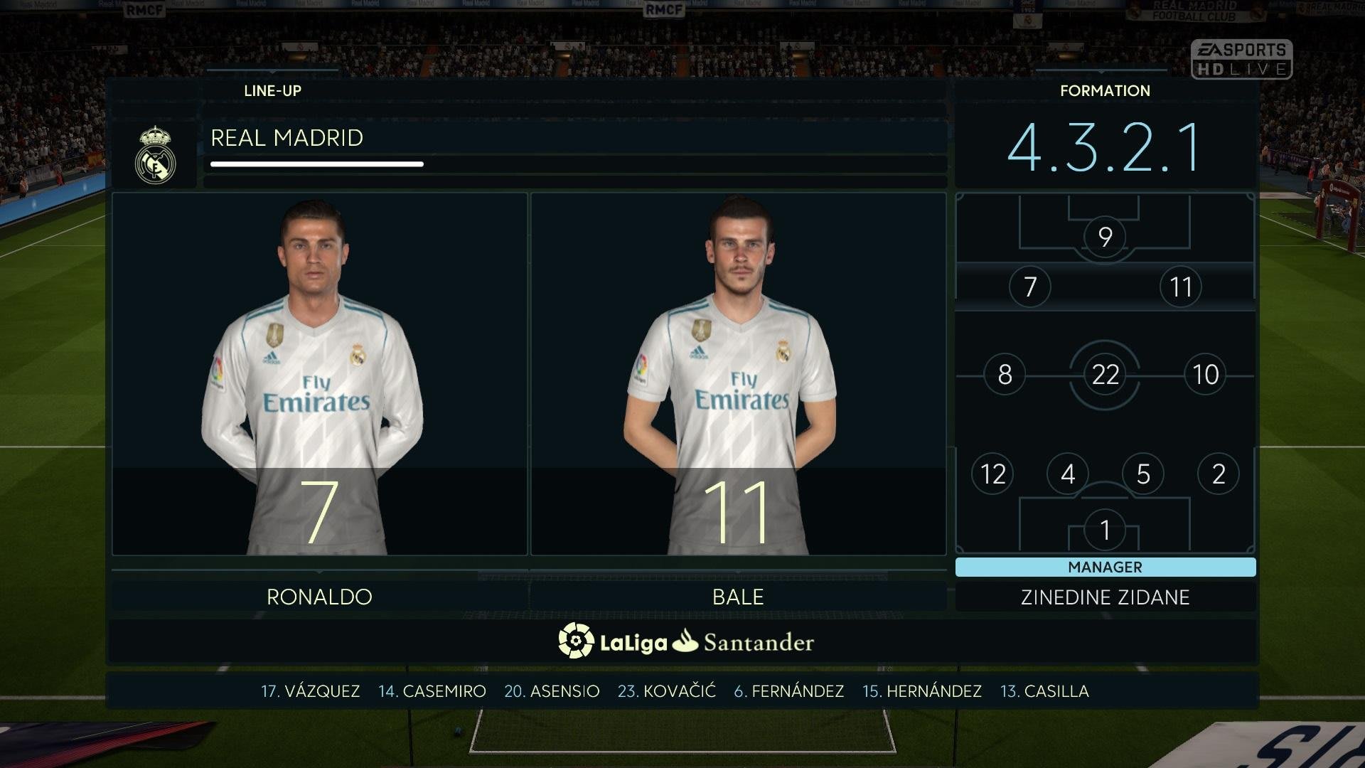 The 4-2-2-2 remains one of Real Madrid's strongest formations in FIFA 18. A popular option in last year's game, the strategy utilises two defensive and attacking midfielders to support a partnership of strikers. This formation allows for Ronaldo to play alongside Benzema upfront, while any combination of Bale, Isco, Asensio, Modrić and Vázquez produces quick-developing attacks from the midfield. Meanwhile, the two DMFs form a strong defensive wall.