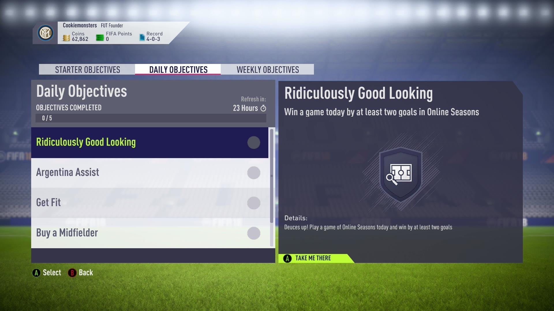 FIFA 18 now has daily and weekly challenges. An extension of the regular yearly tutorial-style FUT objectives which show players their way around FUT, the daily objectives range from 'win a game today by at least two goals in Online Seasons' to 'assist a goal with an Argentinian player today' and even include simple things like 'apply a fitness item'. The best thing is that completing each challenge nets you a reward; sometimes coins, sometimes mini packs. Complete all your daily objectives and get another reward.