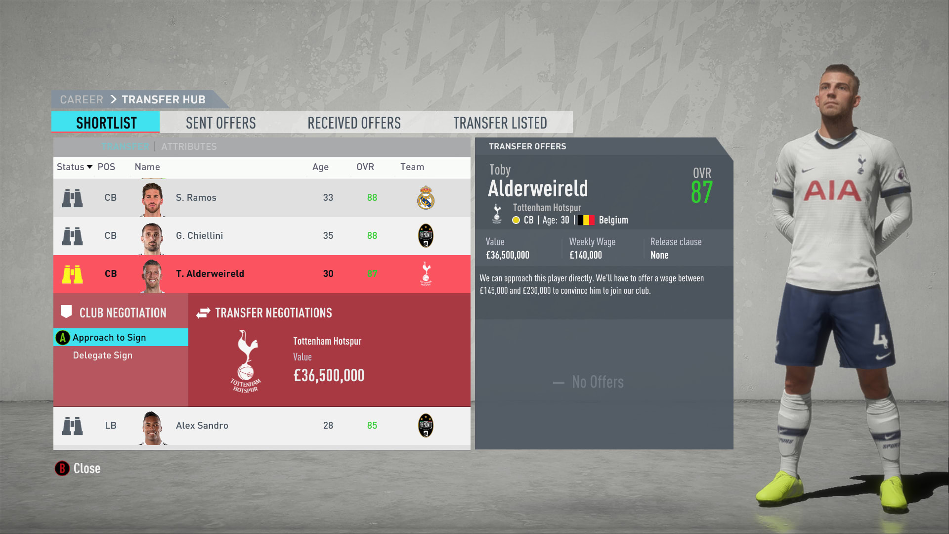 Toby Alderweireld is one of two Tottenham centre-backs you can potentially obtain on a pre-contract (the other being Jan Vertonghen), each adopting an 87 initial overall rating. Paris Saint Germain’s (PSG's) Thiago Silva is another 87-rated CB you can seek out, but his advancing age (34) makes the two Spurs players slightly more favourable when embarking on a multi-season career.