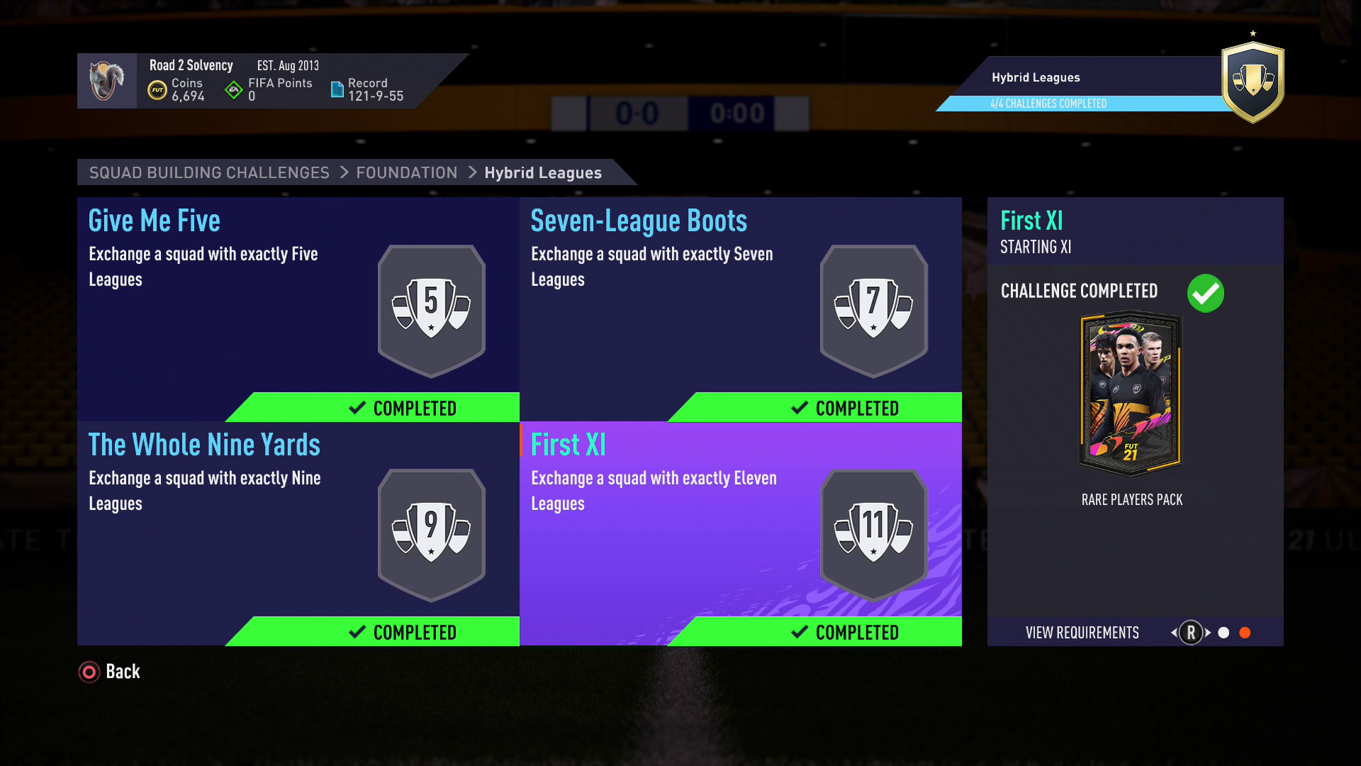 The foundational SBCs (Hybrid Leagues, etc) are a staple of each edition of FIFA, and they are designed to give out very nice packs for relatively little outlay. Ignore the solutions listed on FIFA websites, which are often placed by traders hoping to drive up the price of specific players; you can solve most of these puzzles yourself without spending too many coins.