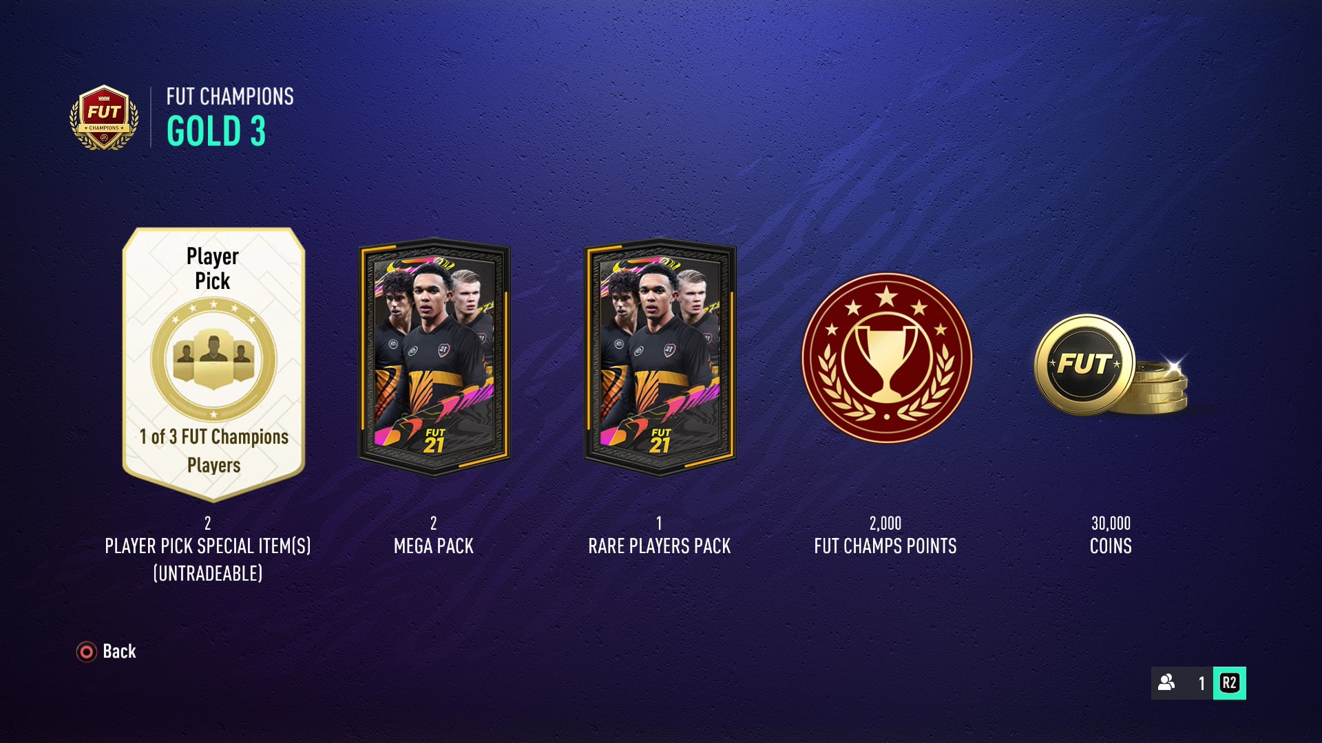 - Gold 3 - 14 wins - 30,000 coins, 2x Mega Pack, 1x Rare Players Pack, 2x FUT Champions Player Pick (1 of 3 players, no max rating), 2,000 FUT Champs points