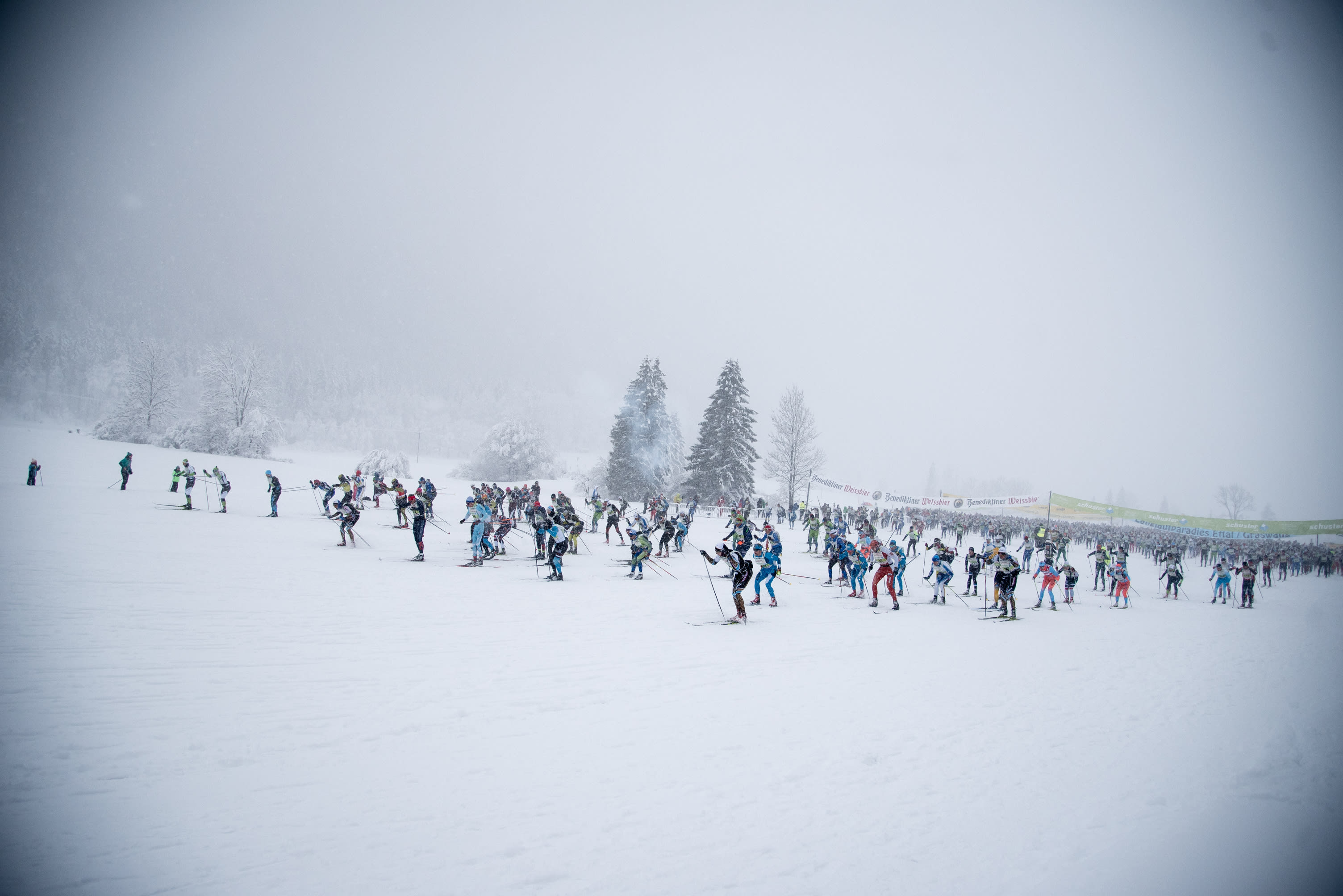 Every year, more than 4,000 experienced skate skiers and cross country skiers plunge into the fresh powdery long-distance trails of snow-covered Bavaria, Germany for the gruelling 50km classic high altitude cross country race and skate.