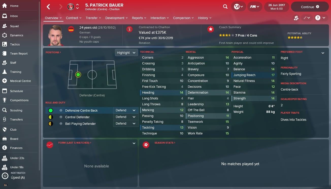 The majority of English lower league teams will advise you to sign Charlton's Patrick Bauer at all costs. The primary reason for this is his potential ability, as the German centre-back can transition into a decent Premier League defender in the coming years. For now, you can take advantage of his excellent heading, jumping and tackling attributes, combined with an impressive set of physical stats across the board.