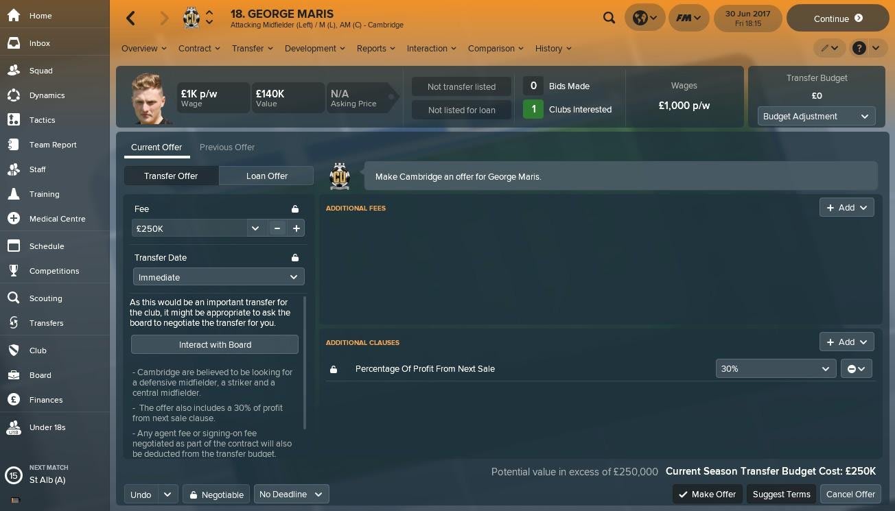 Despite boasting fantastic potential in the English lower leagues, Cambridge's George Maris is classed as a 'rotation' player in FM 2018. That said, the 21-year-old's skills possess plenty of room to develop, with 13 determination and 12 dribbling featuring among his best. Maris is one for the future if you're managing a League One club (or above), but given his low initial valuation, he's worth pursuing early before other clubs take notice.