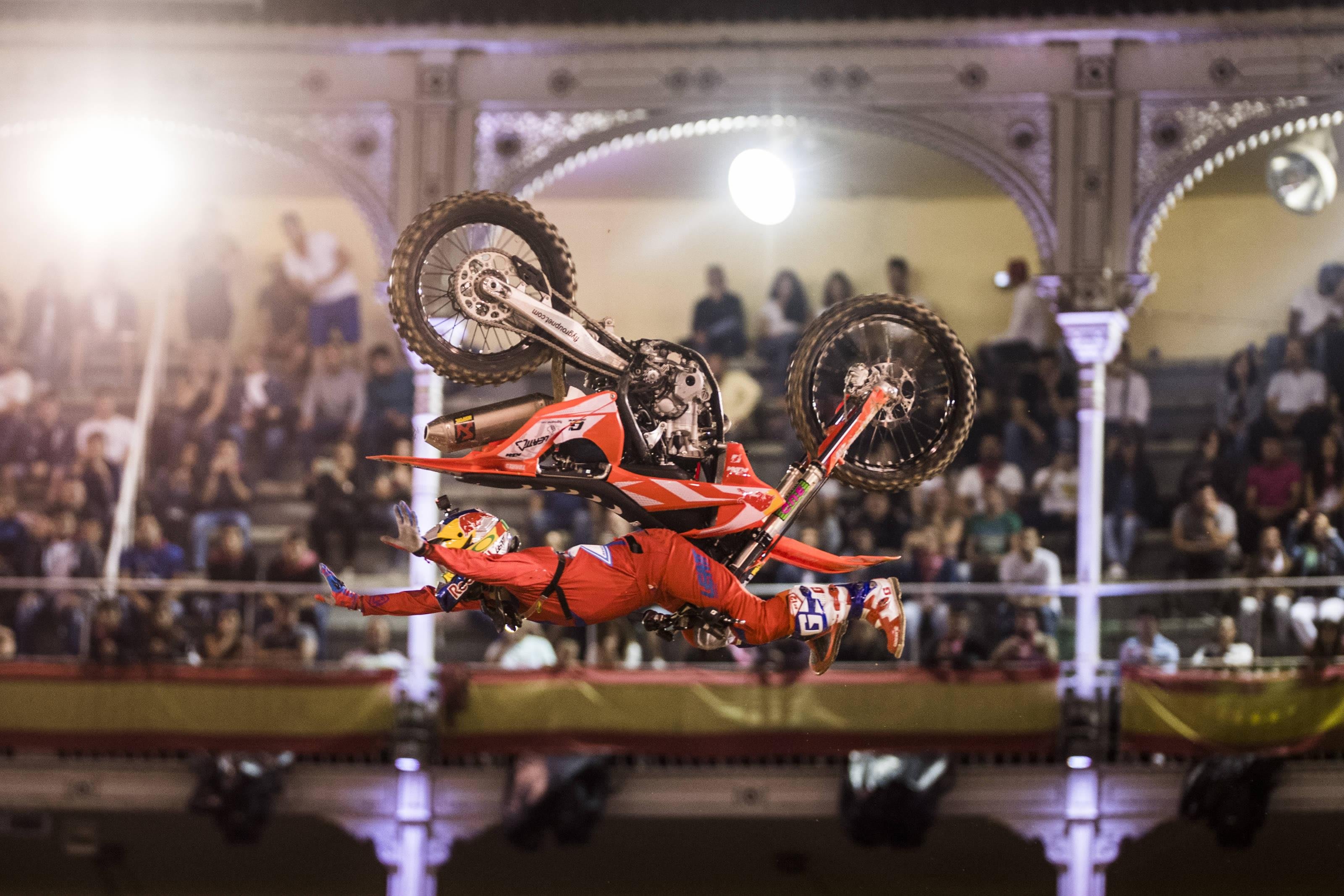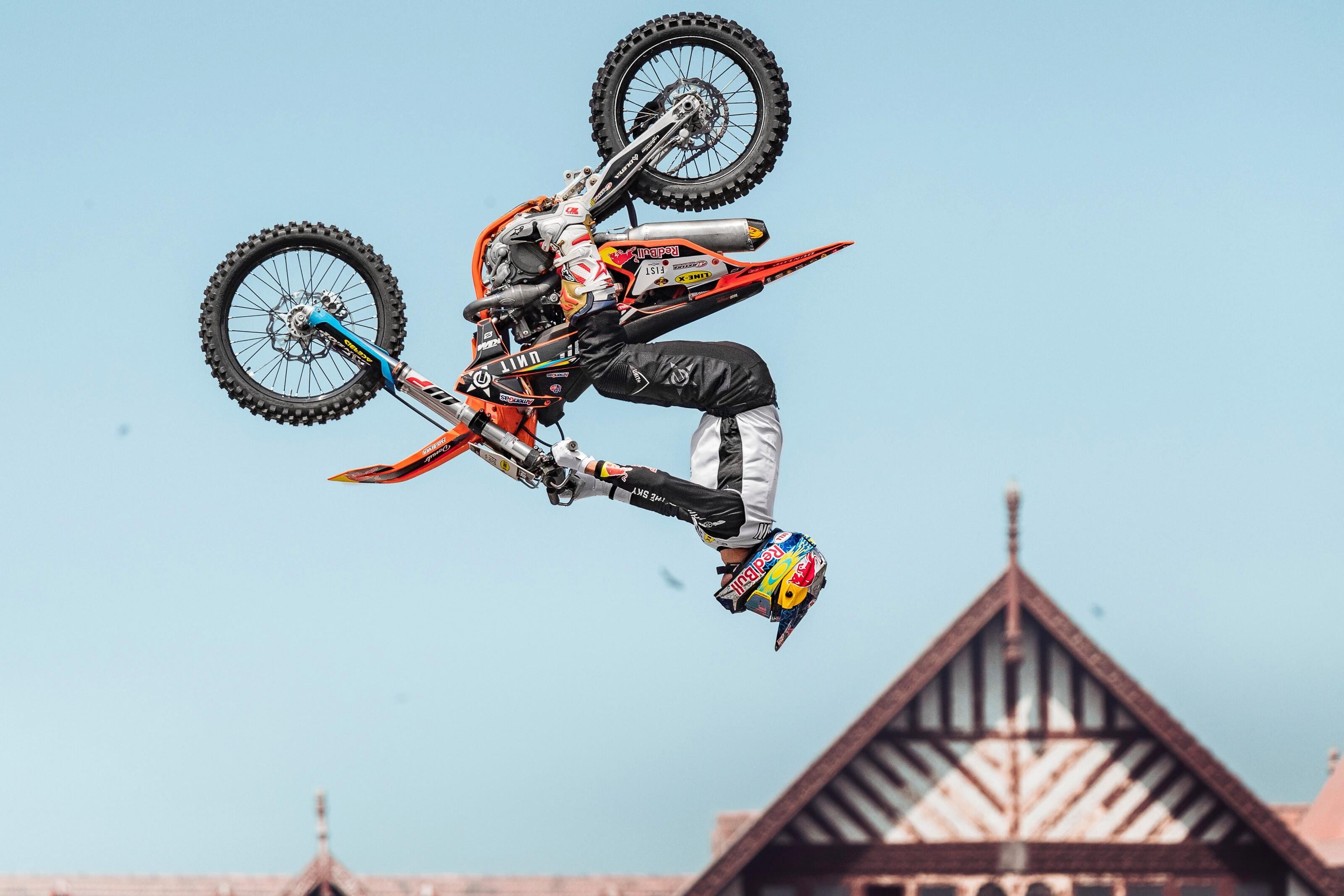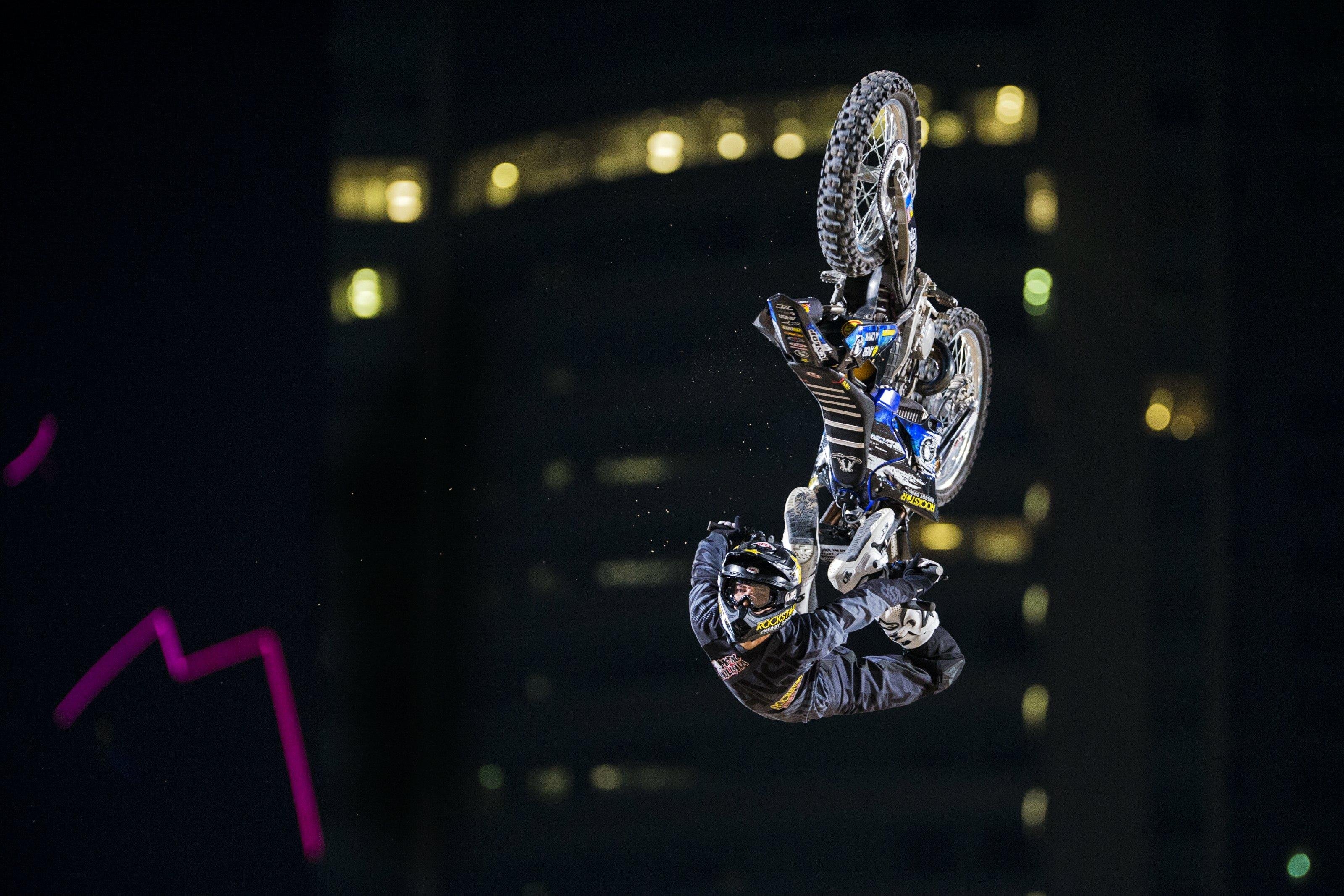 One of the most technical tricks in freestyle motocross. The Special Flip was invented by Special Gregg on a mountain bike and then mastered and brought to FMX by Tom Pagès. The rider leaves the ramp and barrel-roll’s their body above the bike before catching the bike and re-mounting.