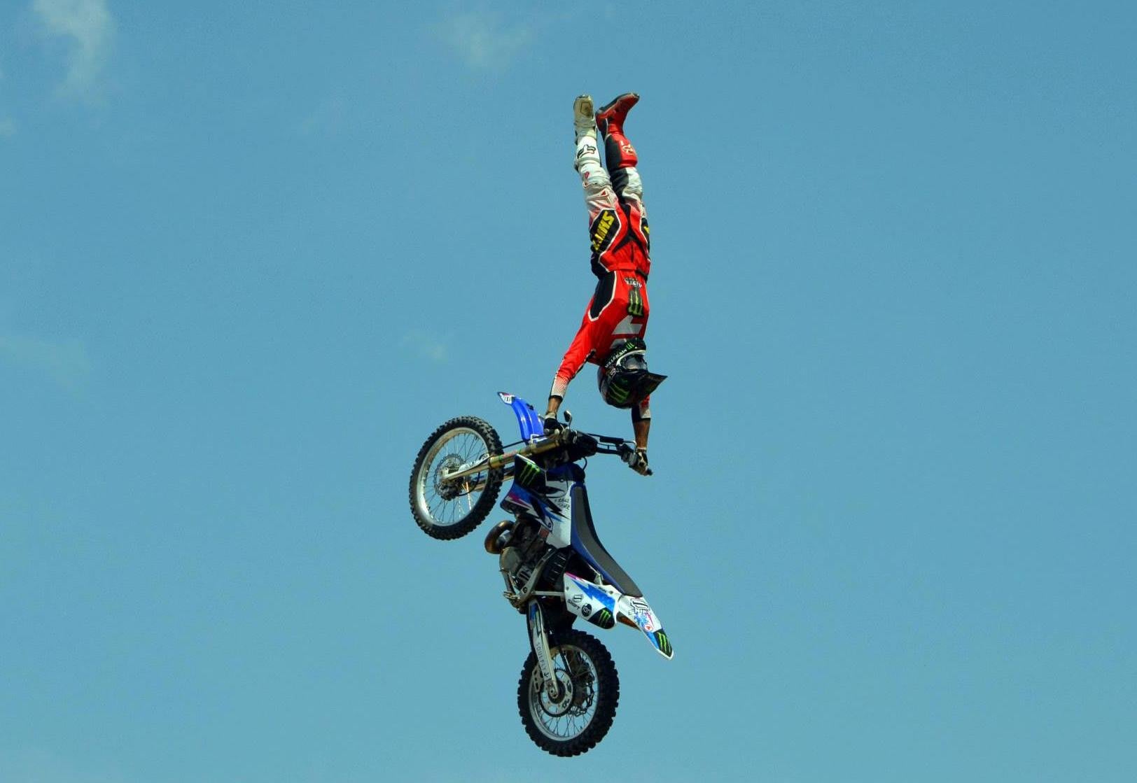 Invented by Carey Hart, The Hart Attack is a progression of the Superman Seat Grab. Instead of flying horizontal above the bike however, the riders body position will be vertical, with their feet positioned up, over their head.