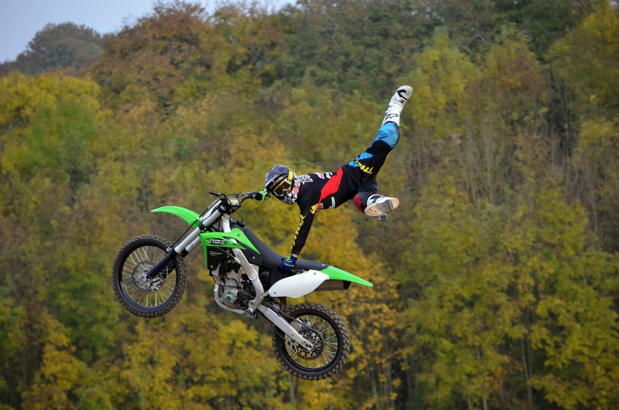 A development of the Superman, A Kiss of Death sees the rider perform a superman, but this time the rear of the bike will drop down, so the rider’s helmet will be close to / touching the front mudguard.