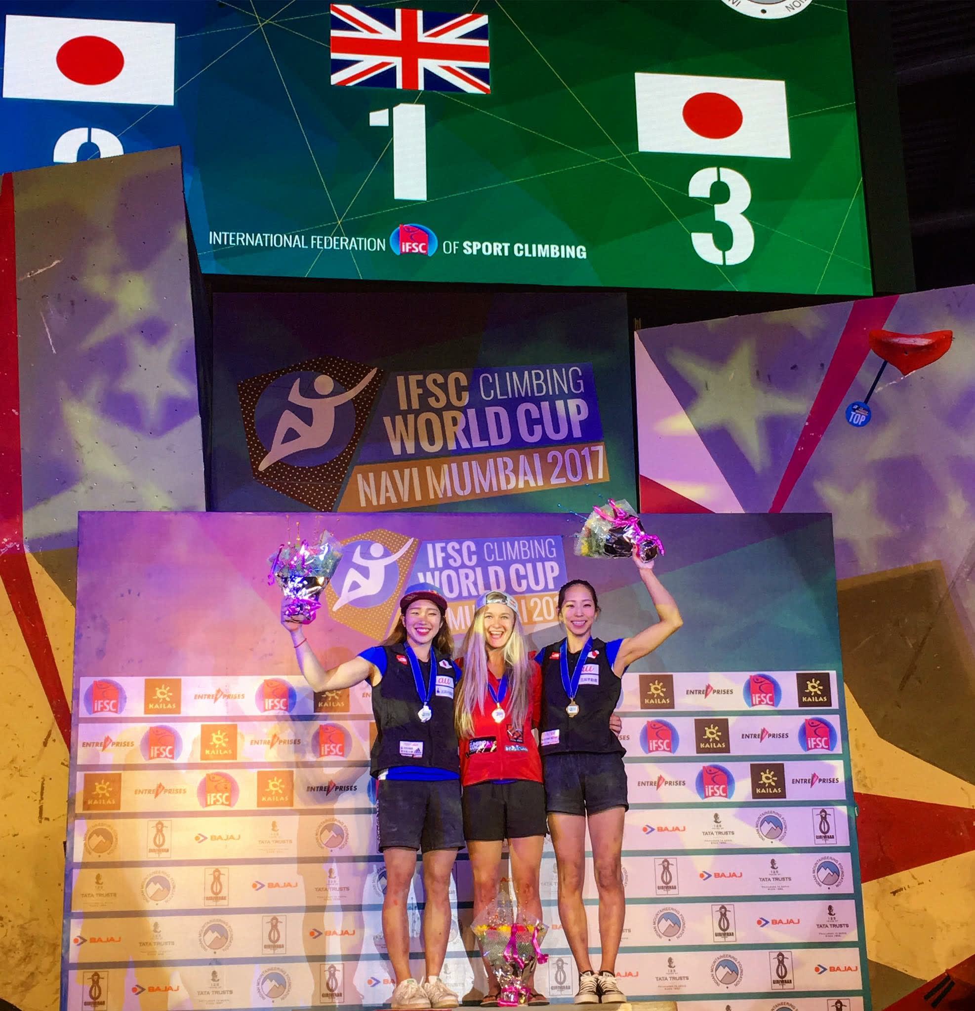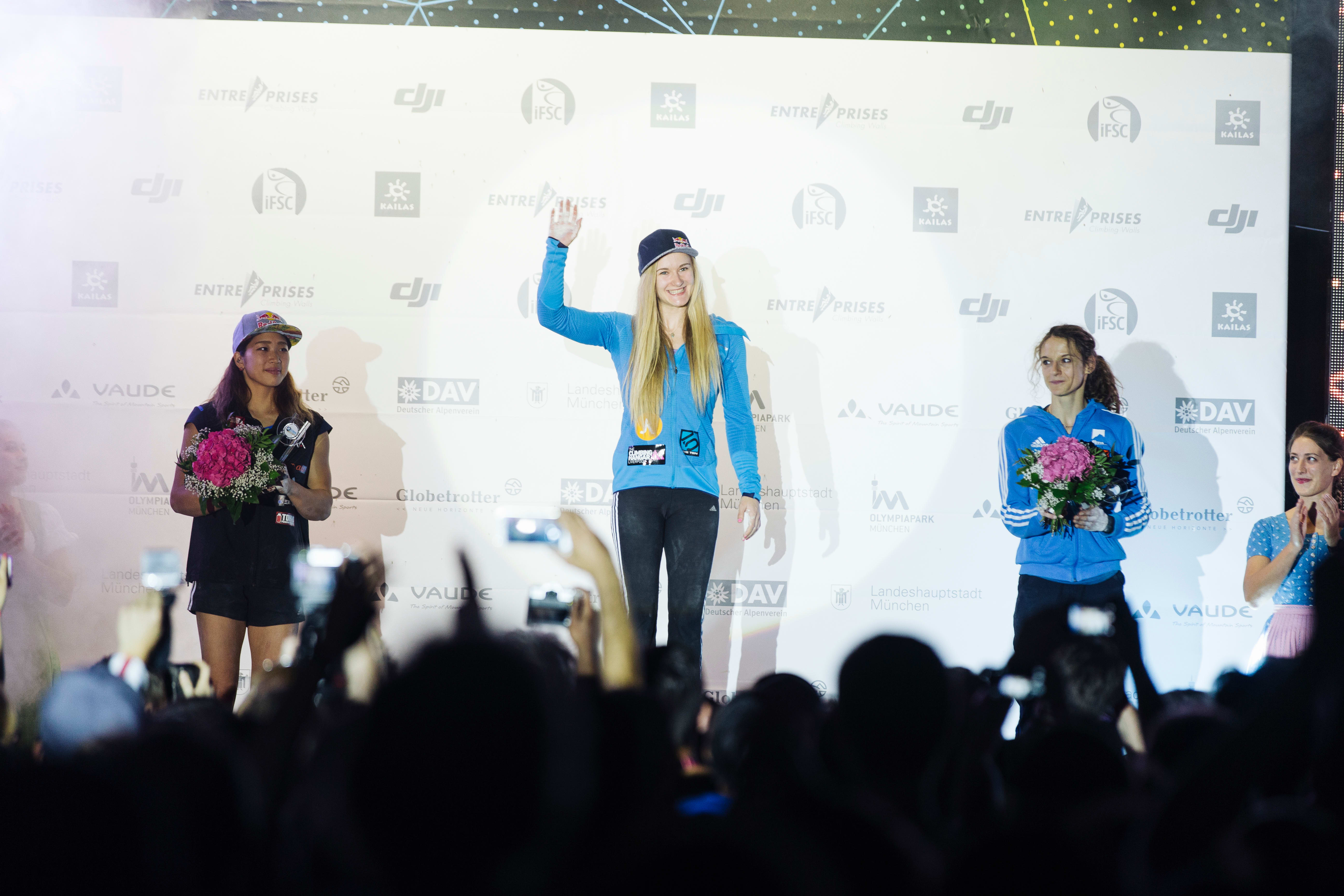 Shauna Coxey celebrating her victory at the 2016 IFSC Bouldering World Cup