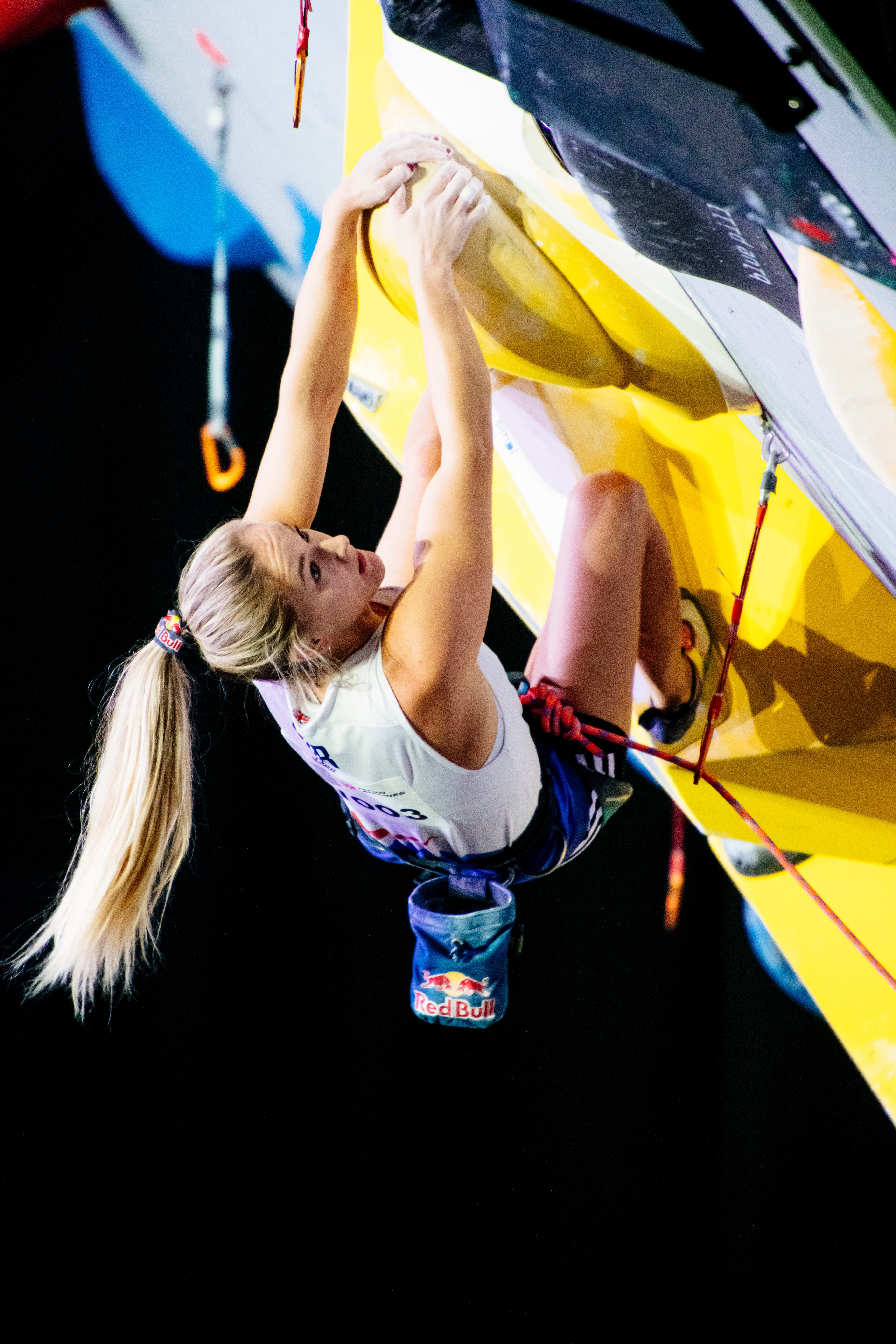Shauna at the 2019 IFSC Climbing World Championships in the lead semi-final
