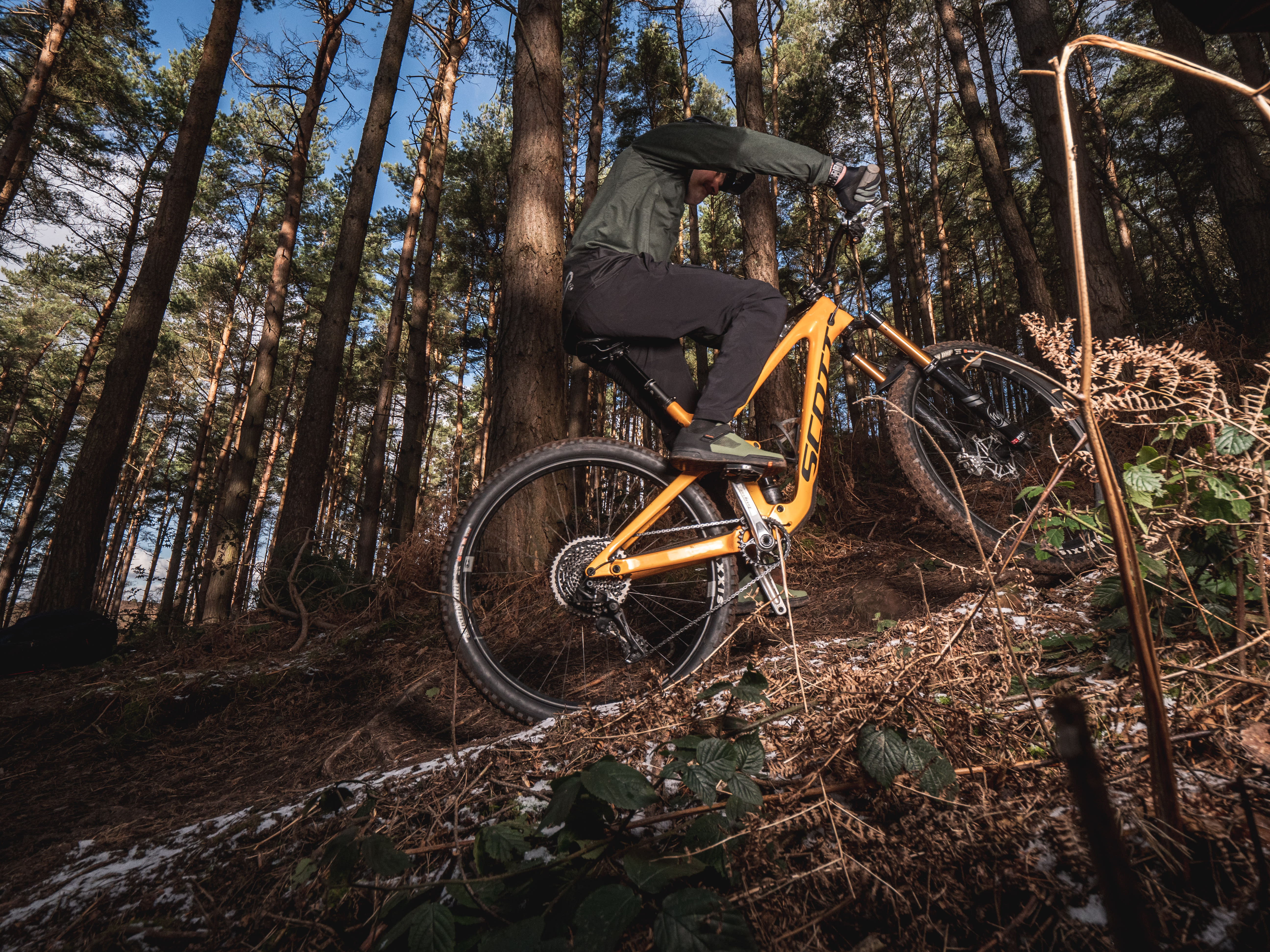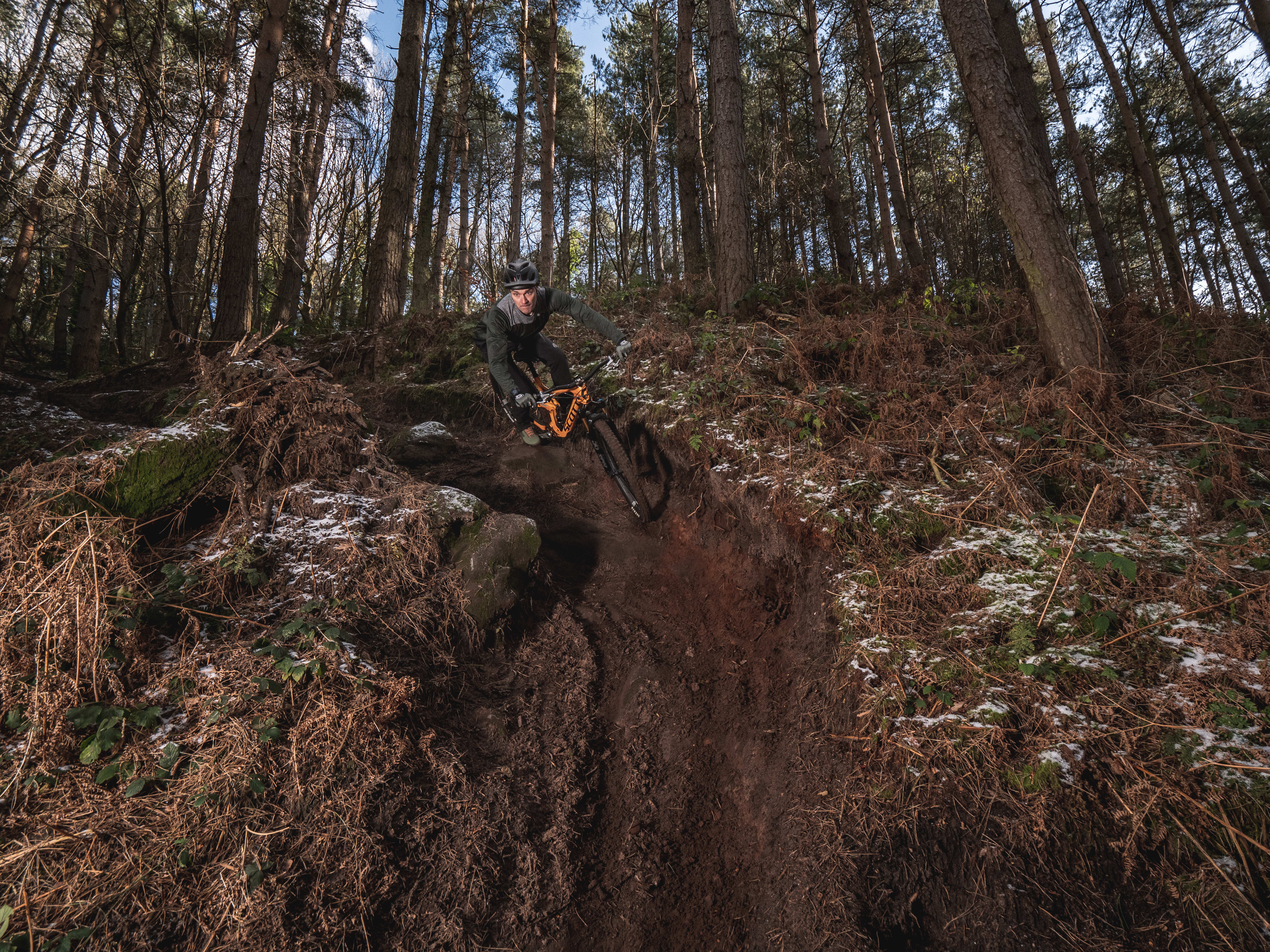 - Practising flat/off-camber turns: Trail centres often have bermed turns throughout, but finding grip and correct body position on flat, or off-camber corners is vital and often overlooked. Setting up a fresh track will let you carve turns into the hill, but emphasising foot position by dropping the outside pedal to find grip where needed, while hips and shoulders facing through the corner and head leading the way will improve grip and speed.