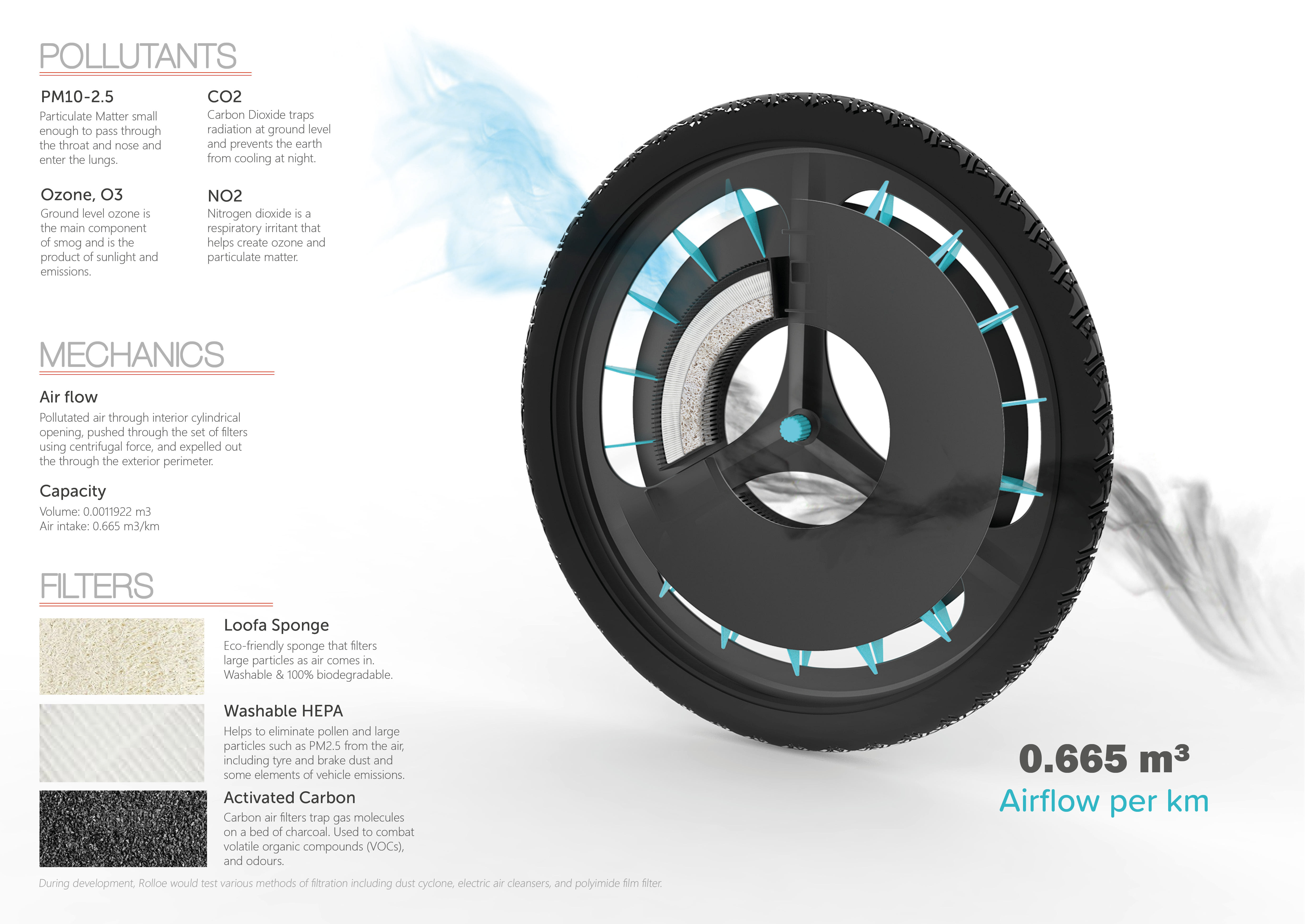Rolloe is a [three-spoke] mag wheel with two side attachments like car hubcaps and filters inside that catch pollution particles. The hubcaps have a cavity in the centre and fins around the edge. As the wheel spins, it sucks air through the central cavity, filters it, then pushes [the filtered air] out through the fins.