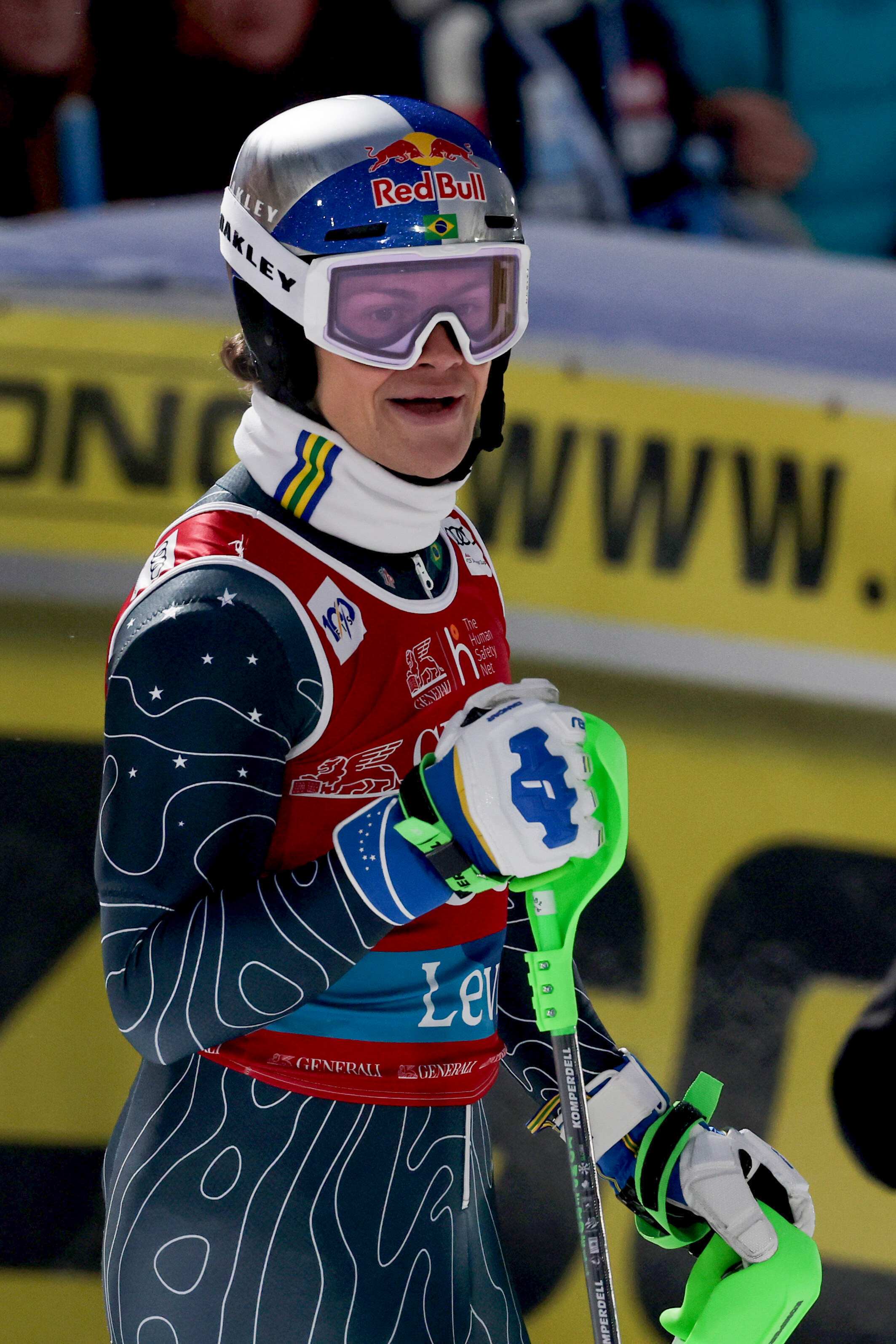 The 24-year-old Brazilian skier celebrates a historical milestone in Adelboden, although he missed out on victory in a dramatic showdown.