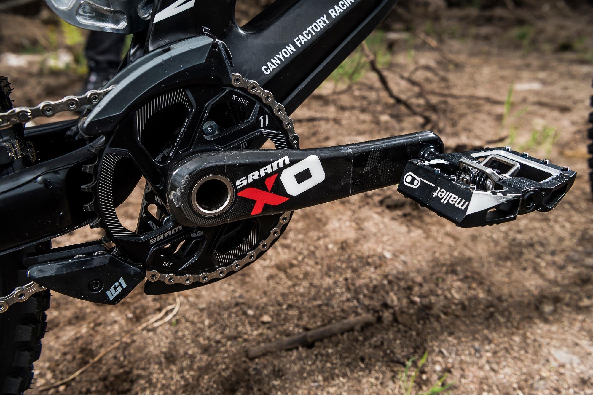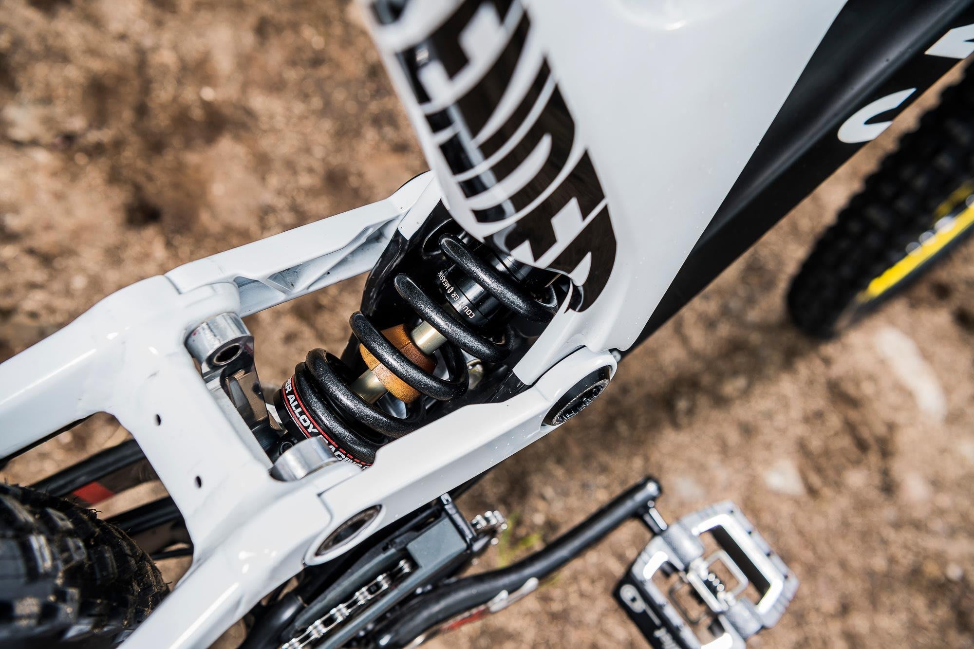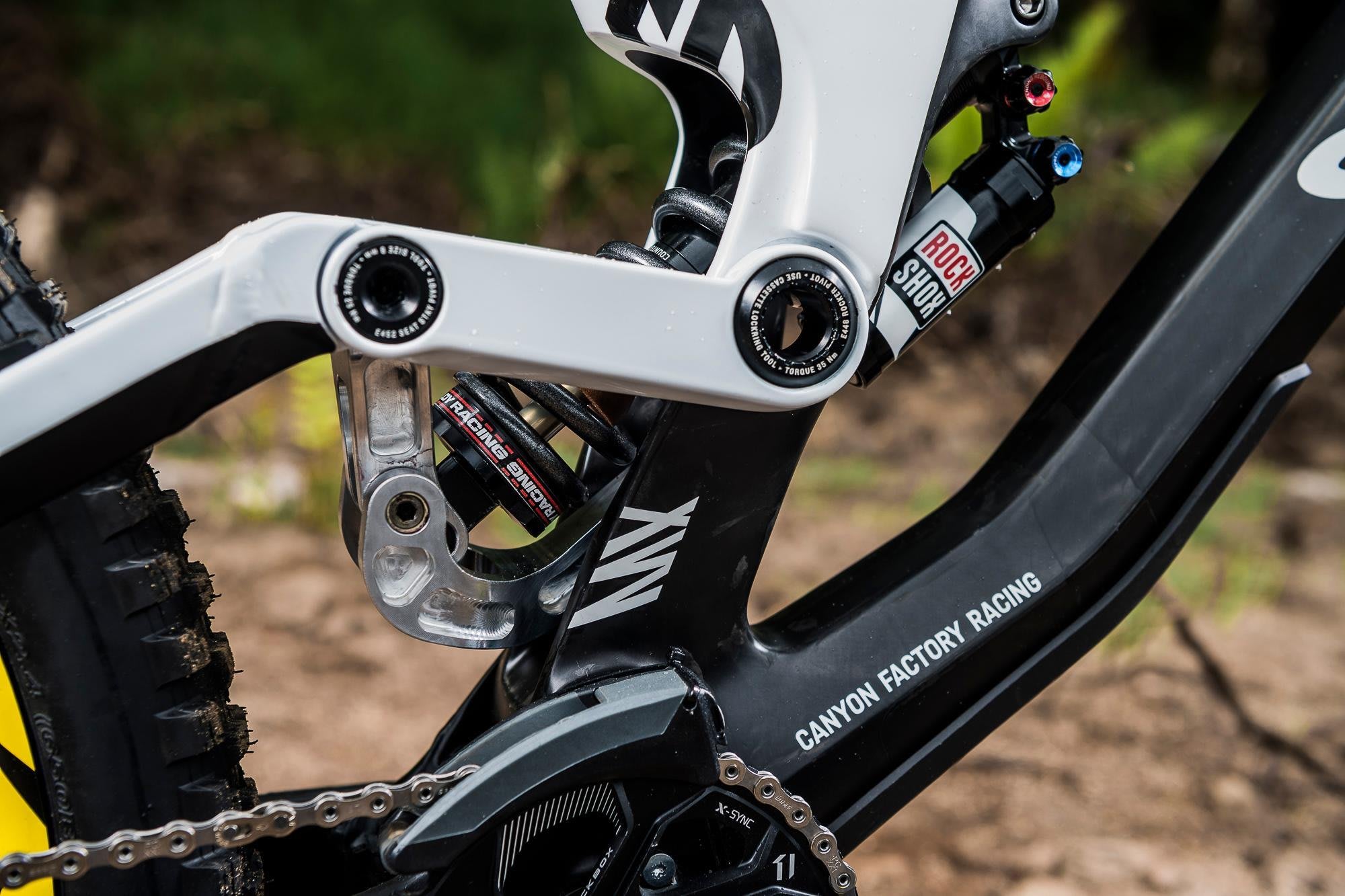 "One of the big differences with the team bike compared to the stock build we started with is the coil rear shock. When we started testing as a team we tried absolutely everything – in the process narrowing down what we liked and didn't like. We ended up with a coil shock, but not with a stock linkage – it's a custom link that Canyon made for us."