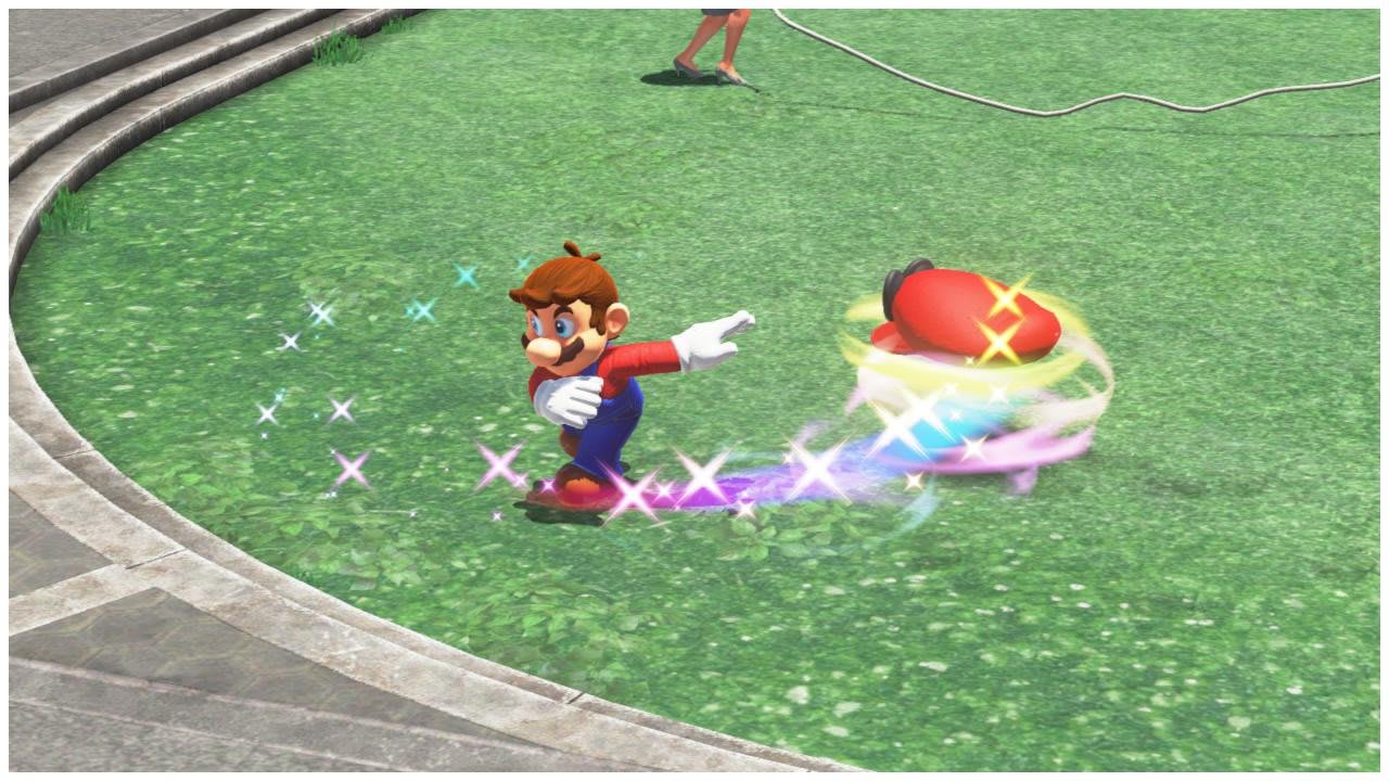 Mario can throw Cappy whether he’s on the ground or in the air, but the latter is especially useful because it can get you out of some tight spots. If you jump and it looks like you’re about to land in danger, move the stick in a different direction and throw your hat. Mario will turn in mid-air, throw the hat and move in the direction he threw it.