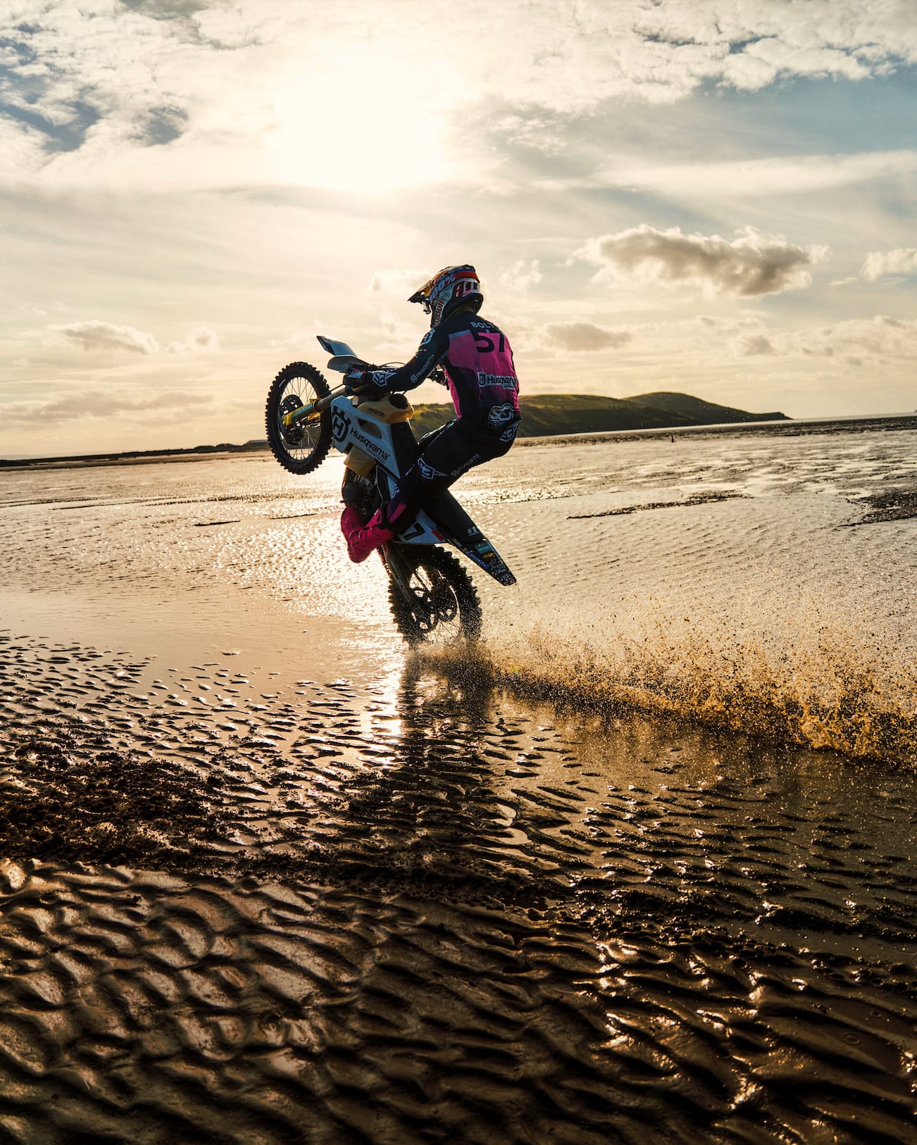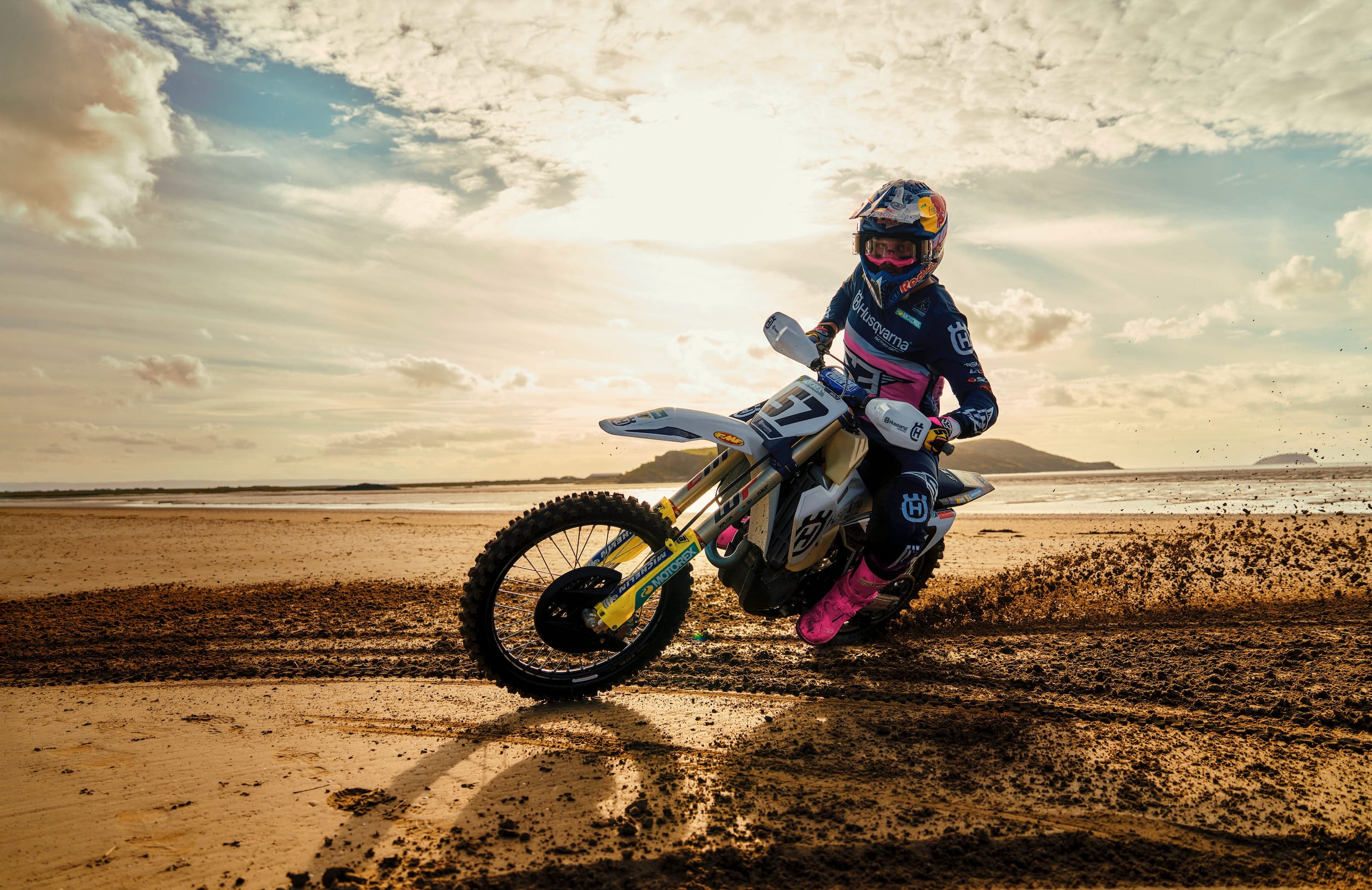 That alone is reason for celebration, but the main buzz on this famous stretch of coastline is created by Bolt’s return to the event for the first time in five years. In between shots, as the shadows lengthen, the five-time world champion in enduro opens up the throttle on his new bike on the sand, tearing from a 100-plus years-old pier, past the camera and towards the promontory known as Brean Down.