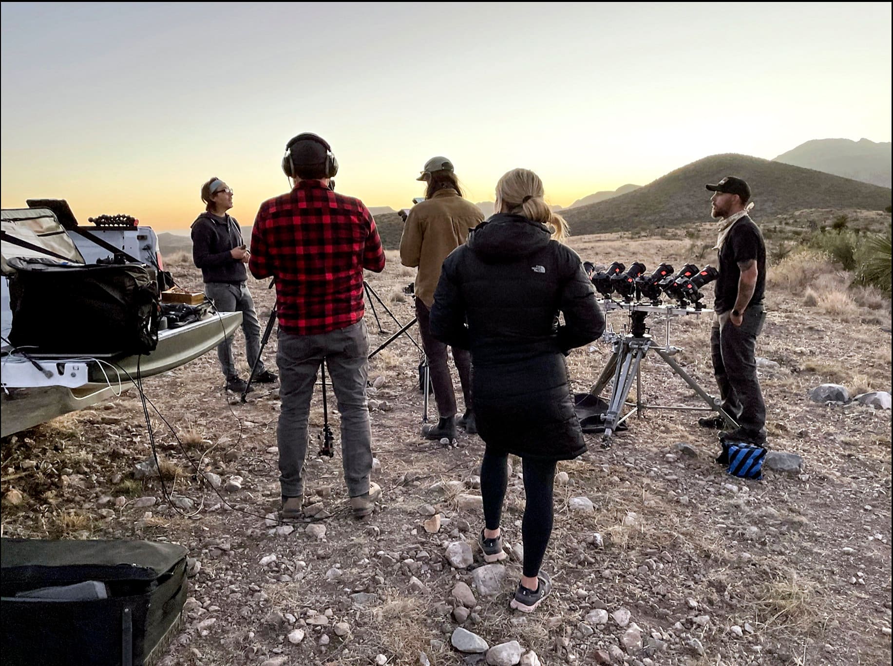 Snipes (pictured left, with his team) first travelled to Marfa last September to scout potential locations for his shoot with the Red Bull Air Force. “It took months of planning,” he says. “There were a lot of moving parts.”