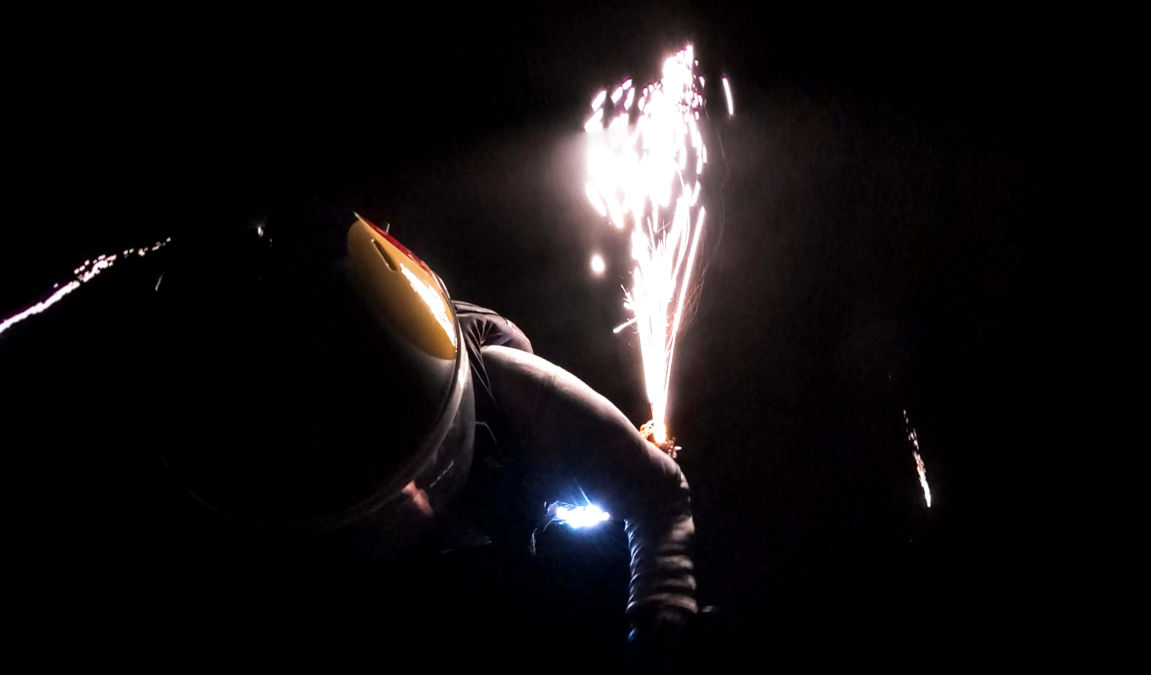 To achieve a comet-like effect, Snipes needed the skydivers to shoot pyrotechnics for as long as possible. No one on the team baulked at the request. The trickier part? Locating the landing area in the pitch blackness. The headlights of two pick-up trucks were all that marked the spot.
