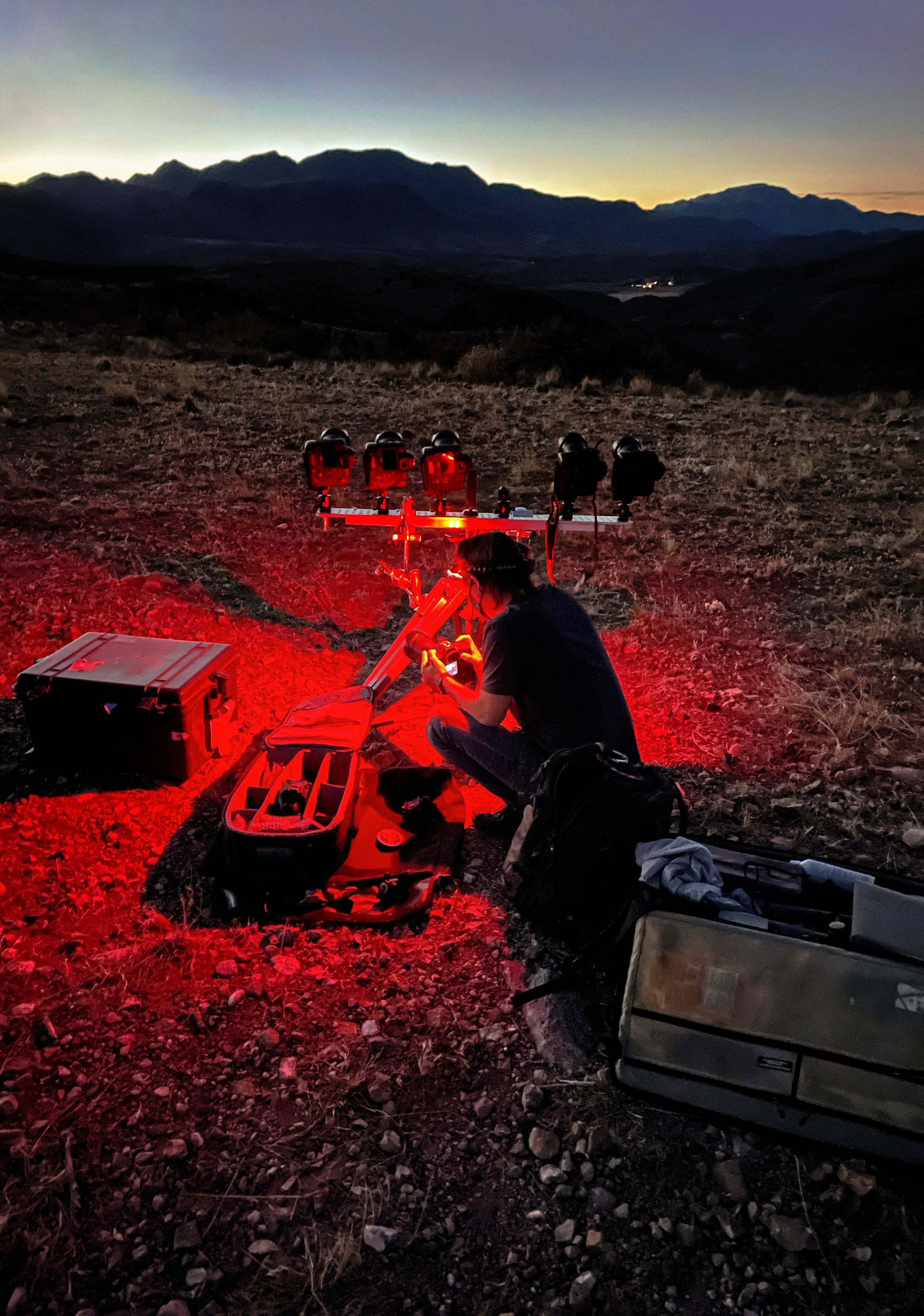 Shortly after sunset on November 15, 2020, Snipes prepares his gear for the first of three evening jumps. Red lights are an essential tool for night photography because they prevent the shooter’s eyes from readjusting.