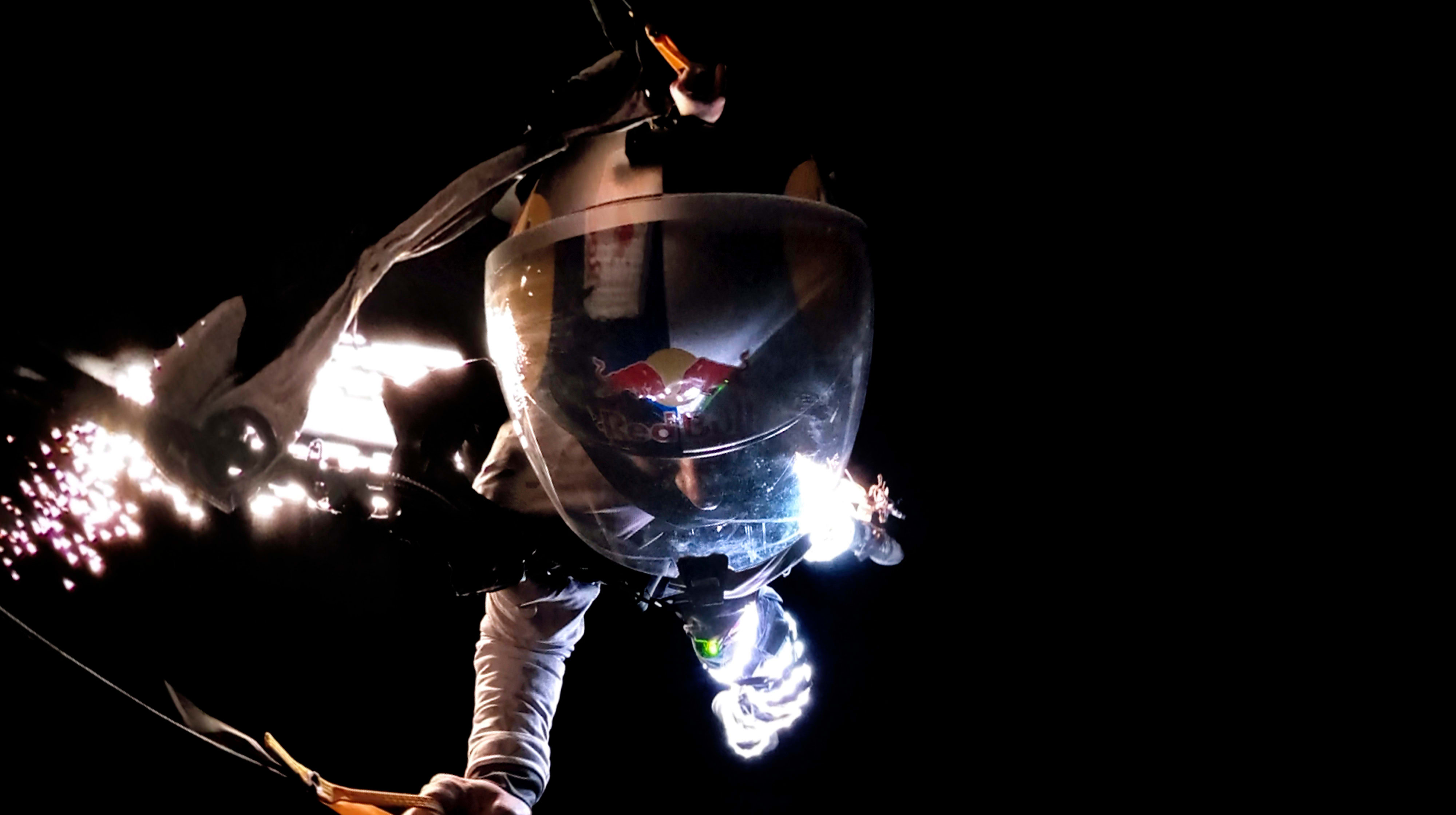 To make themselves visible in a Moonless sky, the Red Bull Air Force wrapped themselves in LED lights; they also added pyrotechnics to help show the speed and energy of the team during free fall. This effect makes the skydivers appear like human comets.