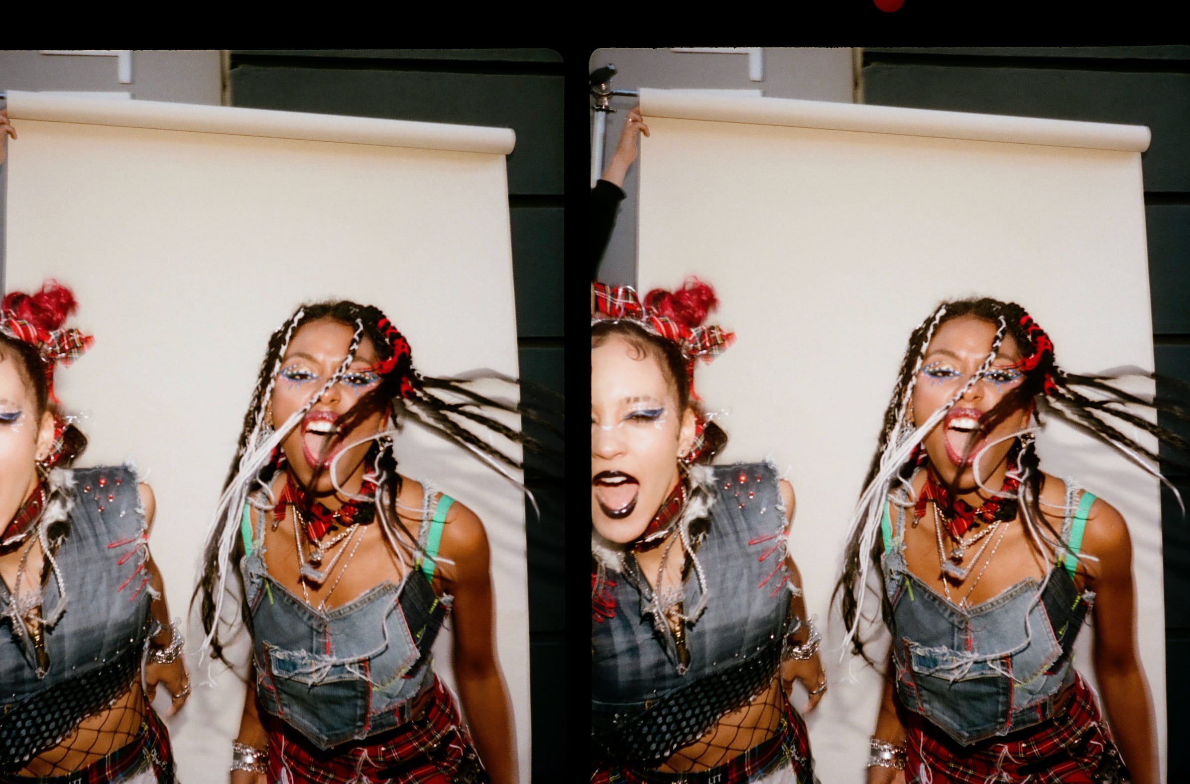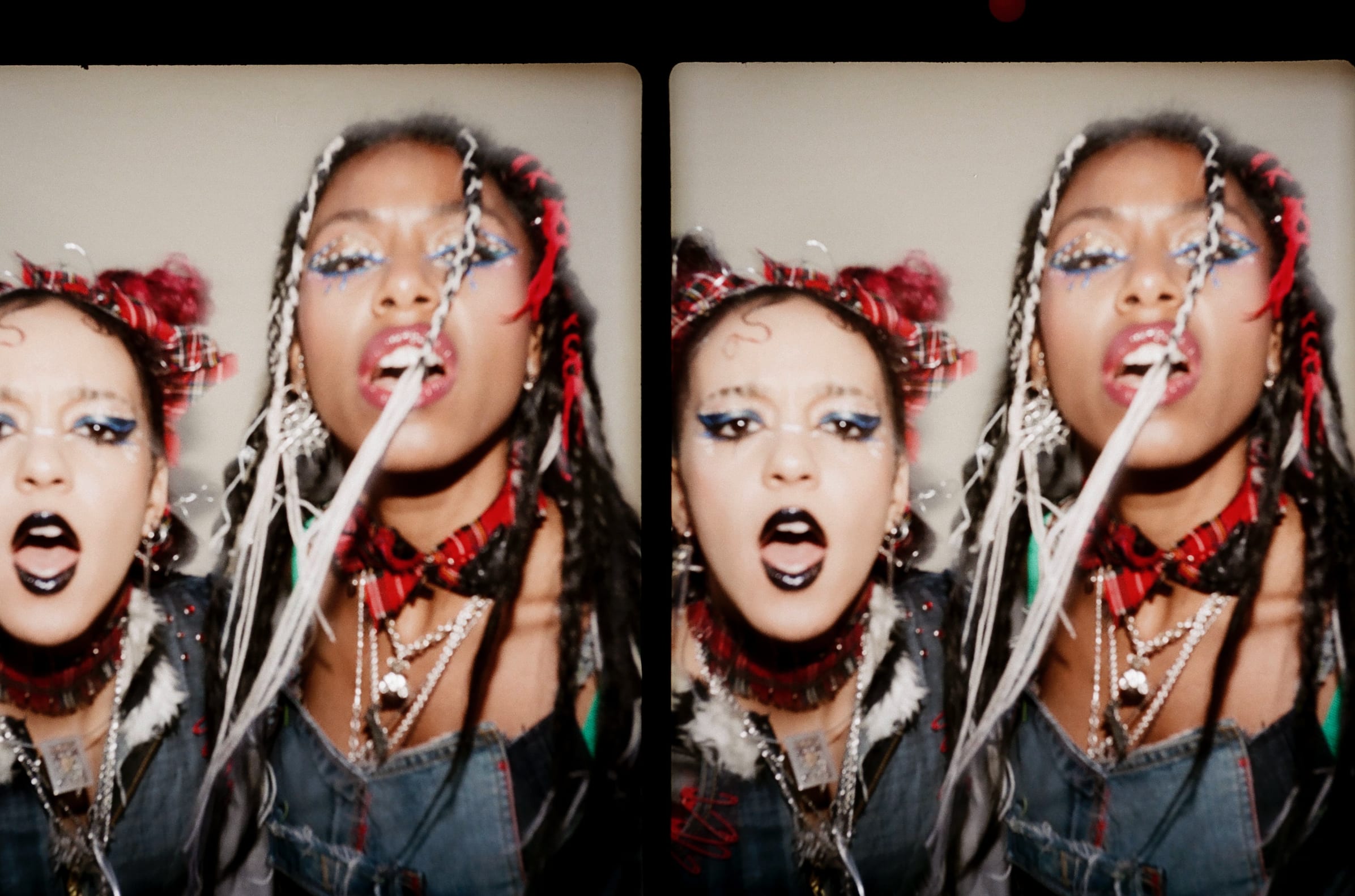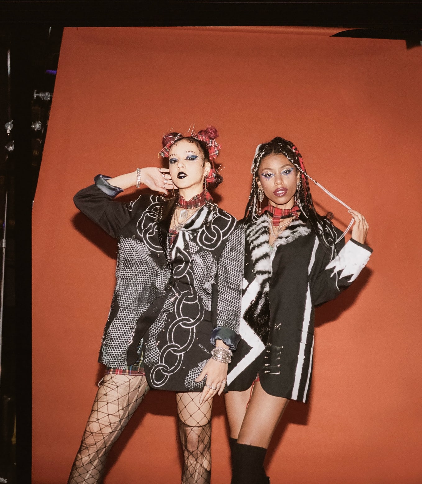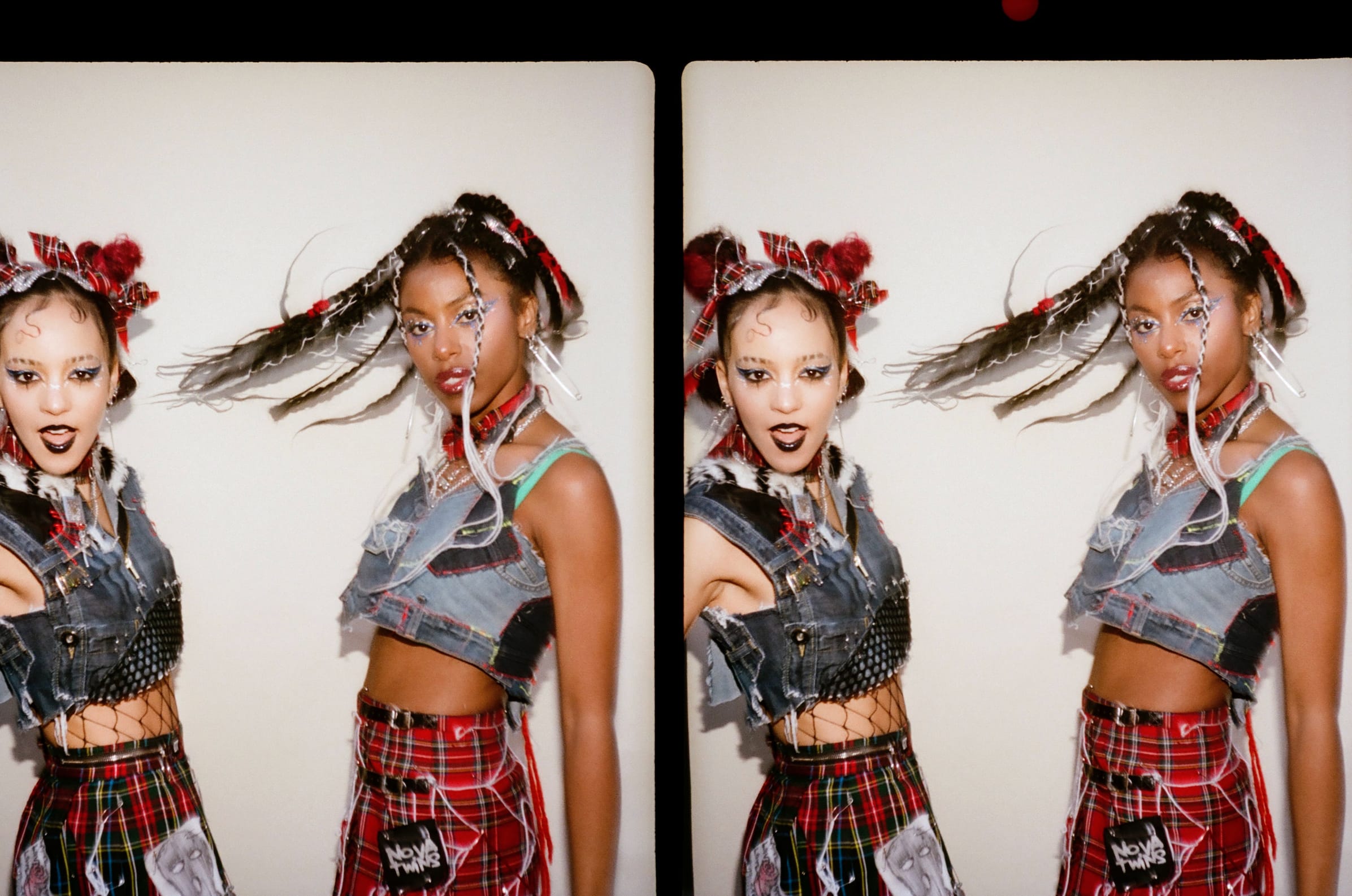 Around the back of the venue, Nova Twins are disembarking from a taxi to prep for their sold-out gig. They’ve had a busy few months. “What a crazy time,” lead singer and guitarist Love exclaims, laughing and theatrically slumping on bandmate South’s shoulder. “We’re a bit overwhelmed.” This will be their third show in as many nights; the pair have travelled up and down the UK over the past 48 hours, playing shows in Glasgow and Manchester before driving to London in the early hours. But as they greet today’s team, neither reveals any sign of weariness. Their faces immaculately painted in statement Nova Twins make-up, the pair are dressed in heavy black boots, handmade tartan and animal-print miniskirts, and blazers. They jump out of the car and excitedly greet everyone with smiles and hugs, making sure they remember everyone’s names. Then bassist South wraps a huge zebra-print faux-fur coat around her shoulders and the duo stride into the venue together.