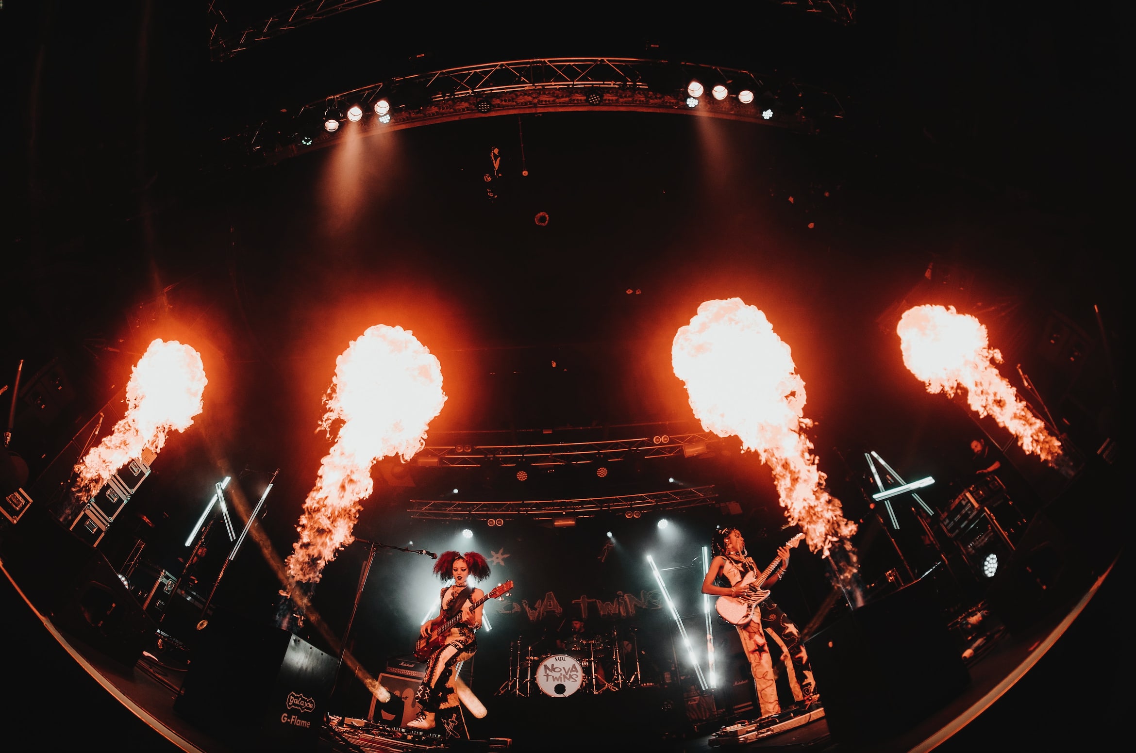 Four giant standing lights at the back of the stage flash in sequence – N-O-V-A – and a wall of fire shoots into the air as South and Love bounce on stage and rip into their first song. The crowd instantly parts to create the first mosh pit of the night. By the second track, both women have jumped off stage and are playing in the pit alongside them. “Everyone gets in the pit at our shows,” says Love. “It’s lovely to see women, non-binary people, a mixture of older men and women, as well as younger ones. We always keep an eye out for everyone’s safety, but if you know our band, you know what we stand for: respect, no matter where people are from, what they look like, or what their gender is. Everyone deserves respect.”