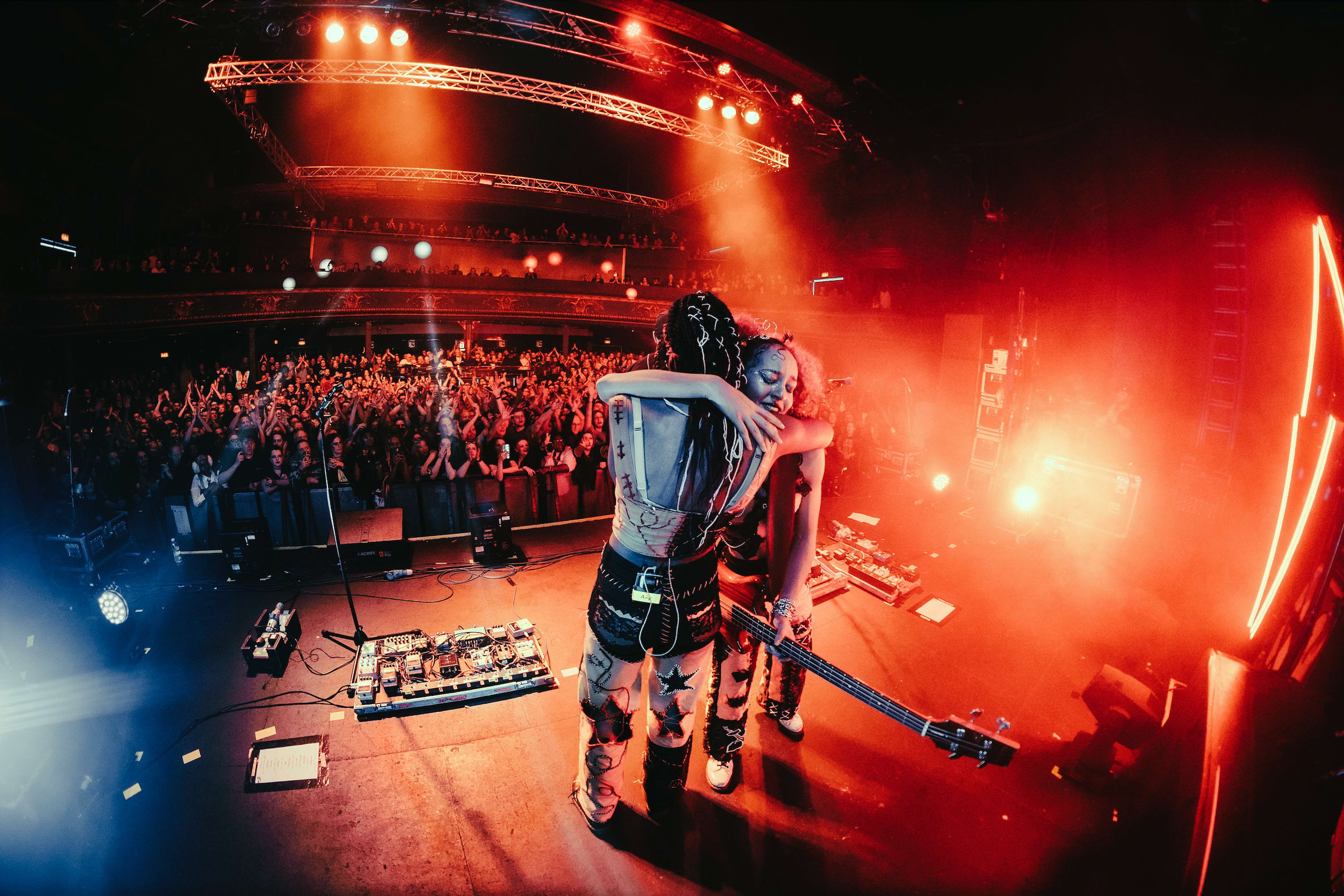 On an unseasonably sunny Saturday in November, the queue of people outside south London music venue Electric Brixton is rapidly growing. They’re here to see Nova Twins, aka Amy Love and Georgia South, one of the most electrifying live acts on the UK music scene, and the diversity of ages, genders and sartorial looks in the 1,500-strong line reflects the duo’s inclusive, genre-busting appeal. With a sound that spans punk, rap, pop, rock, metal, R&B and more, Nova Twins have been likened to everyone from Rage Against the Machine to Cypress Hill and Missy Elliot during their stratospheric rise in popularity over the past two years. If the broad spectrum of artists they’ve been invited to support in the past 12 months – from stadium fillers like Bring Me the Horizon and Prophets of Rage to Yungblud, Enter Shikari, Skunk Anansie and Sleaford Mods – is any indication, no corner of the alternative music scene is immune to the band’s charms.