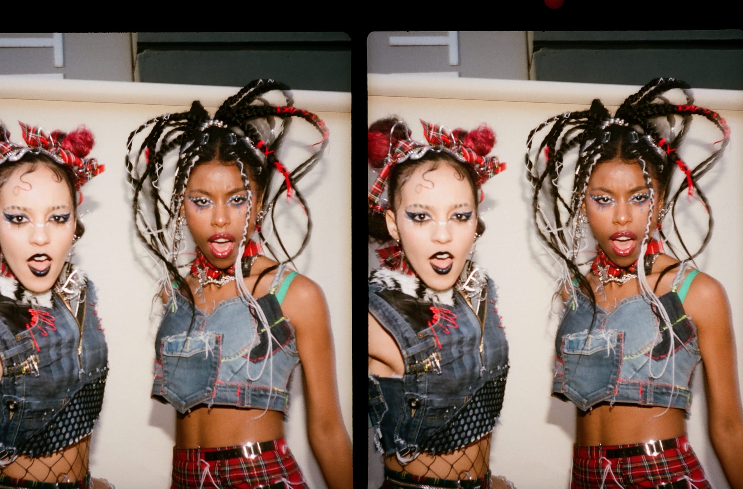 In person, Nova Twins are chaotic and hyperactive, their personalities perfectly mirroring the playfulness of their personal style. Love, the elder of the two, is poised and charming, while South is sweet and animated, bouncing between people with an infectious enthusiasm. Among the organised chaos of gig prep, they frequently huddle up to chat, whispering jokes and making each other laugh. It’s the kind of easy bond that comes from having spent years together.
