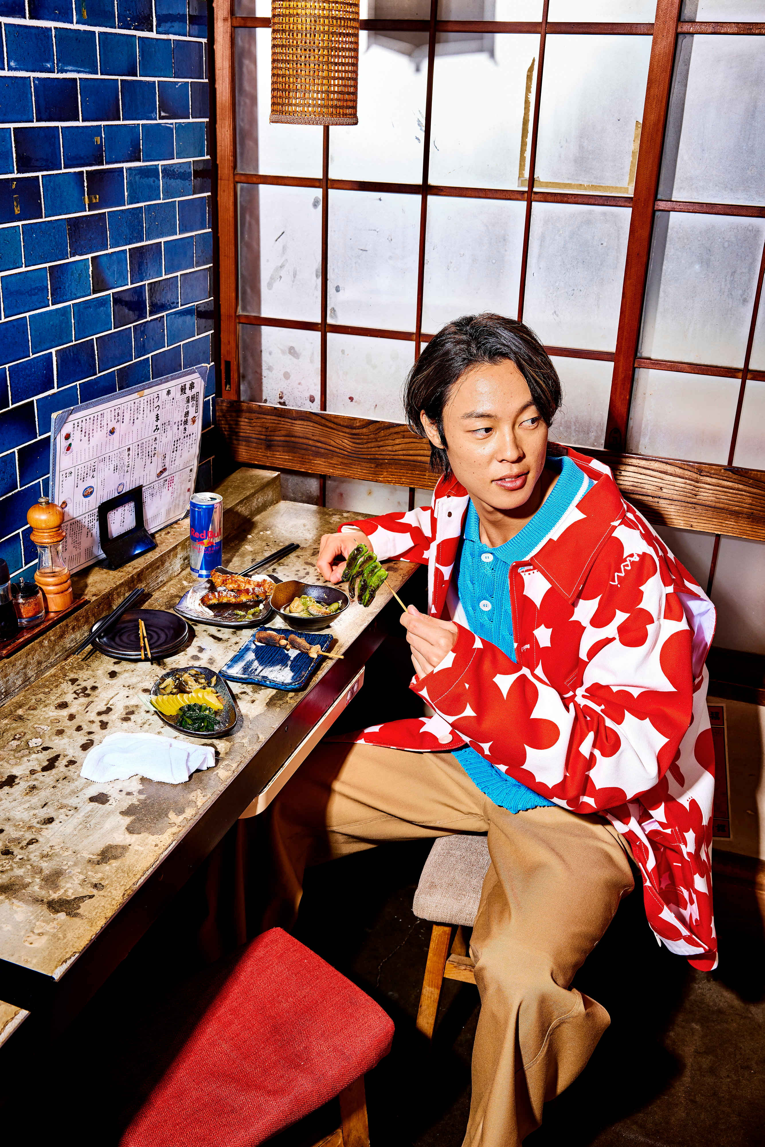 Recently, he’s been enjoying the endless-summer fantasy paintings of Japanese artist Hiroshi Nagai and the polka-dot-centric work of Yayoi Kusama. Despite this easy-breezy approach, he shows no sign of hesitation at Tamano-yu, whether on the potential drawbacks of jumping off a half-century-old bath or when modelling clothes. He just goes for it. Kobayashi leaps from the ledge around 15 times, jogging over to the photographer to check the results. “My face looks so funny here!” he laughs at one shot. Shooting wrapped, he talks with the owner of the public bath, snaps some photos with him, and signs a white autograph board in the lobby. Throughout, he seems comfortable being the focus of attention. “When I first met Ryōyū, about 10 years ago, he was nothing like this,” remarks Tomohiro Maruyama, CEO of Team Roy. “He was reserved and often nervous. He’s completely changed in the last decade.”