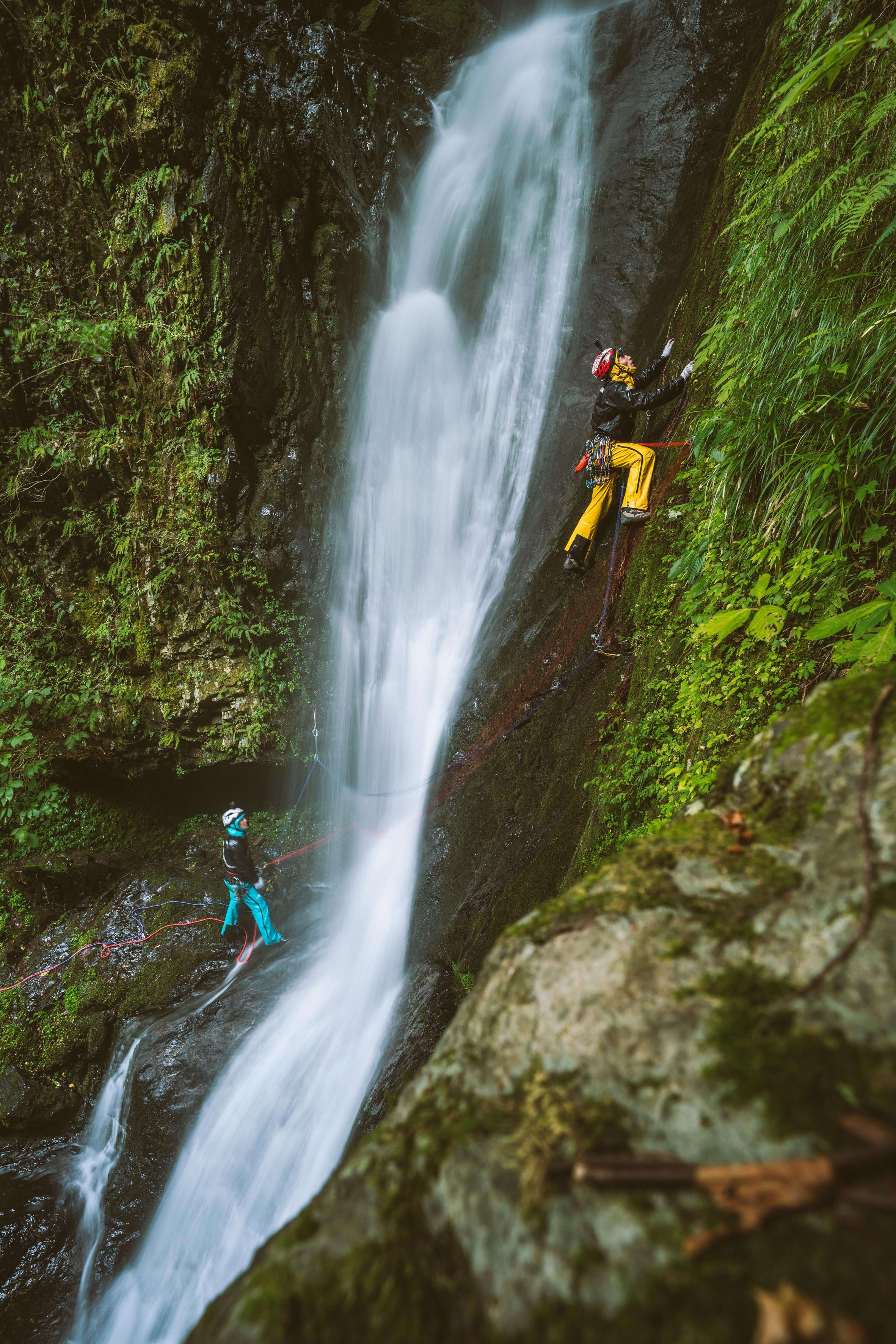 “The team aspect is something I miss from regular climbing, as climbing itself can be really selfish,” says Pearson. “It’s you and your activity. Even if you have a belayer, even if they’re a friend, they are not that emotionally involved in your climb. They just want to have a good climb and go to the pub at the end of the day. Whereas with sawanobori, as a group, you’re trying to get up this waterfall, and it’s good to work together. So if you get to a tricky step a friend will climb on your shoulders to reach a hold, or they’ll lie across the flow of water to make it less powerful.”