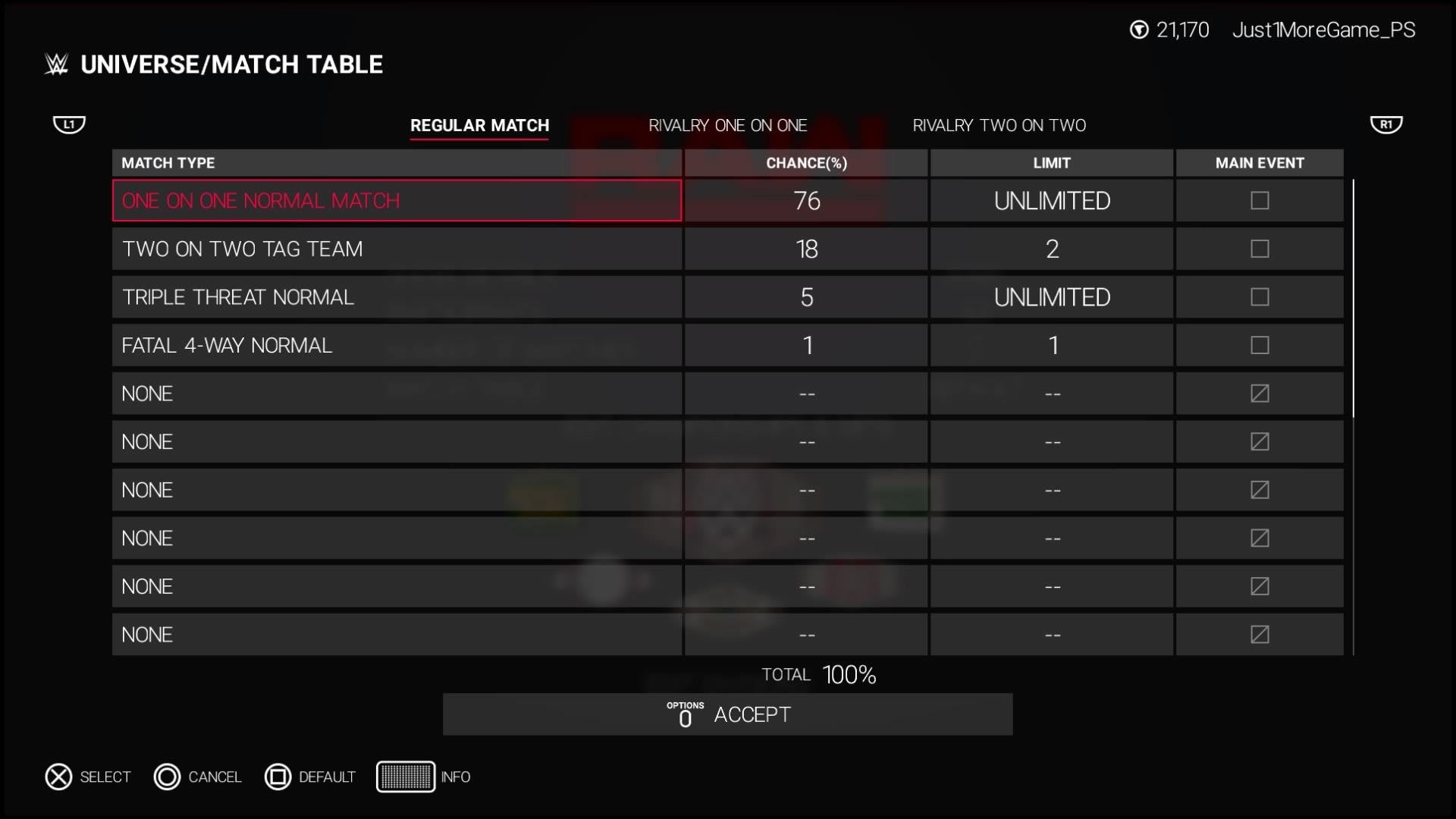 If you’re finding that matches aren’t taking the form you’d like in Universe Mode, you can alter this via the new Custom Match Table feature. This forces the AI to prioritise certain match types over others, allowing you to make an all-hardcore promotion, for example. You’ll need to customise the likelihood of these matches occurring via a percentage system, and from then on, you should find your WWE Universe taking a more tailored shape.