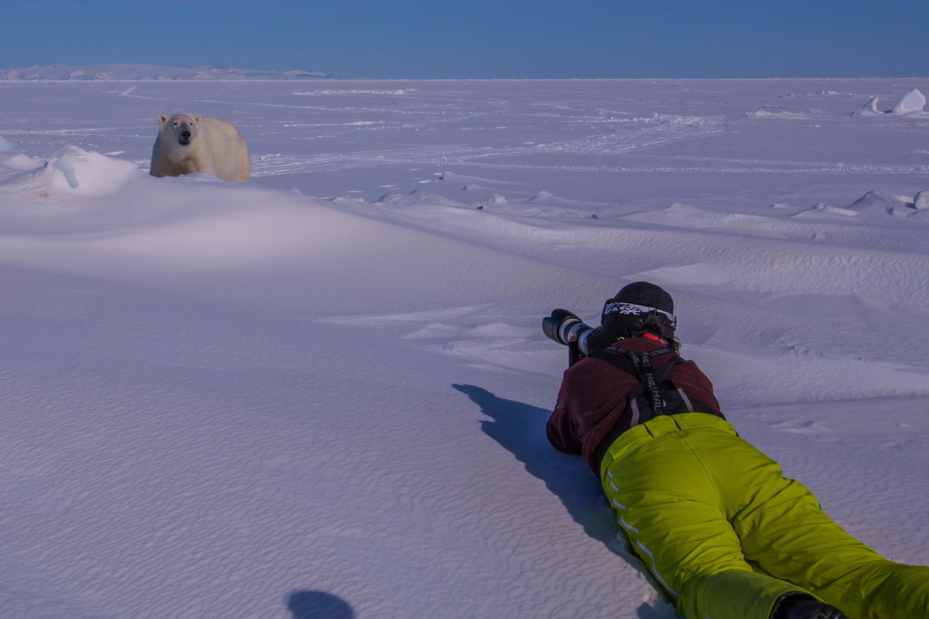 O φωτογράφος Amos Nachoun πήρε αρκετά μέτρα ασφαλείας πριν βγάλει αυτή τη φωτογραφία με την πολική αρκούδα. “Είχα δυο ξεναγούς Inuit και ένα snowmobile με την μηχανή ανοιχτή. Αλλά αυτό που δίναμε περισσότερη προσοχή ήταν η κατεύθυνση του ανέμου – γιατι ούτως ή άλλως με τη μυρωδιά η αρκούδα καταλαβαίνει ποιος είναι γύρω της. Όσο ο άνεμος φύσαγε από την αρκούδα προς εμένα ήμουν ok.”