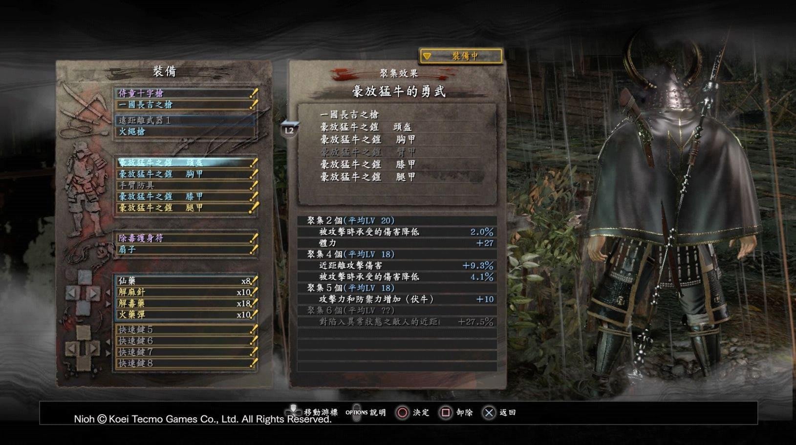 《Dark Souls》系列一直以來都有裝備套裝設計,但作用只限於交待劇情,與及令角色裝扮比較統一。《仁王》同樣有套裝系統,更方便的是它甚至有套裝獎勵,同一系列裝備越多件上身就可以獲得額外能力。沒錯,就跟刷裝備就是真理的「芒亨」一樣。