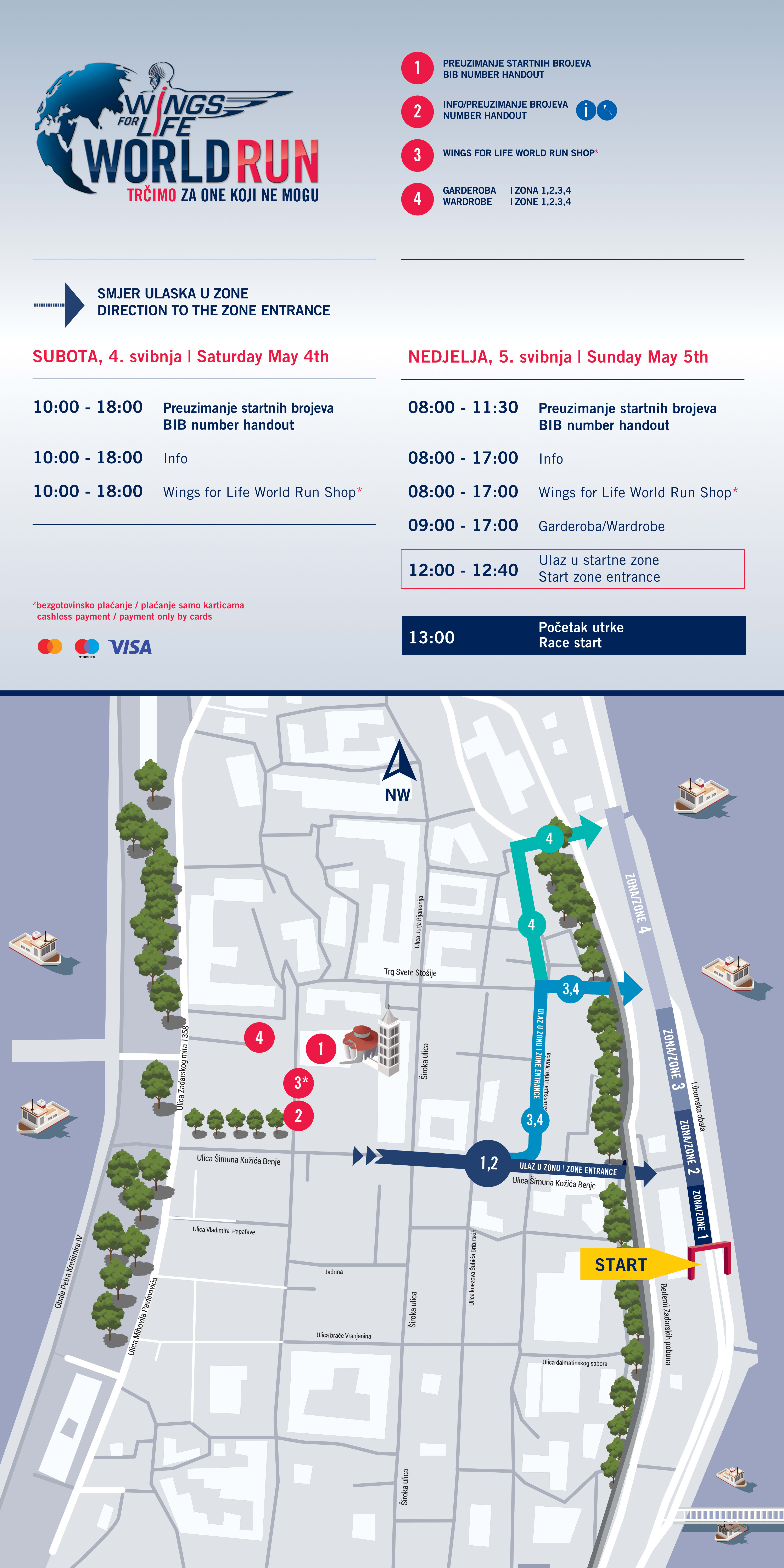Utrka u Zadru jedina je službena Wings for Life World Run utrka čija se ruta proteže uz more - i to od starta pa sve do dolaska presretačkog vozila. Utrka kreće s Liburnske obale, a s obzirom na to da započinje startnim pucnjem u 13:00 sati po lokalnom vremenu, važno je u startne zone ući ranije, kako bi svi sudionici bili spremni za utrku. Ulaz u startne zone počinje u 12:00 sati.