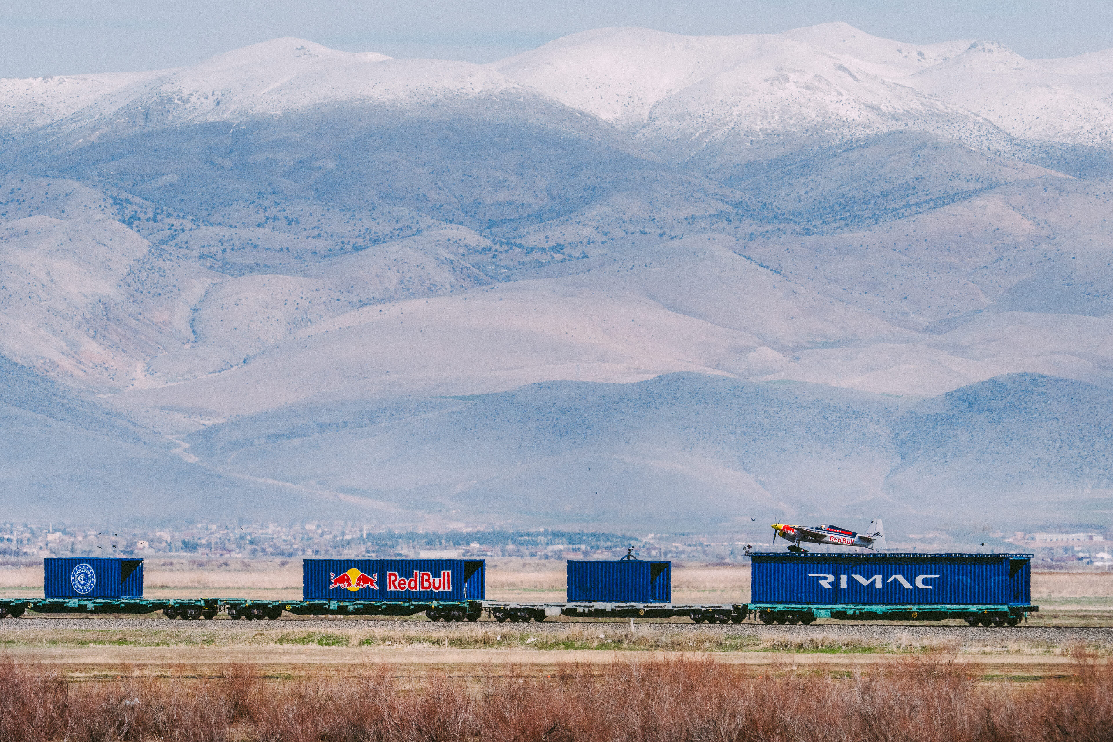 Történelmi jelentőségű repülési bravúrt hajtott végre vasárnap Dario Costa, a Red Bull olasz pilótája: a világon elsőként sikeresen leszállt egy mozgó tehervonatra, majd ugyanarról a konténerről újra fel is szállt Afyonkarahisarban, Törökországban.