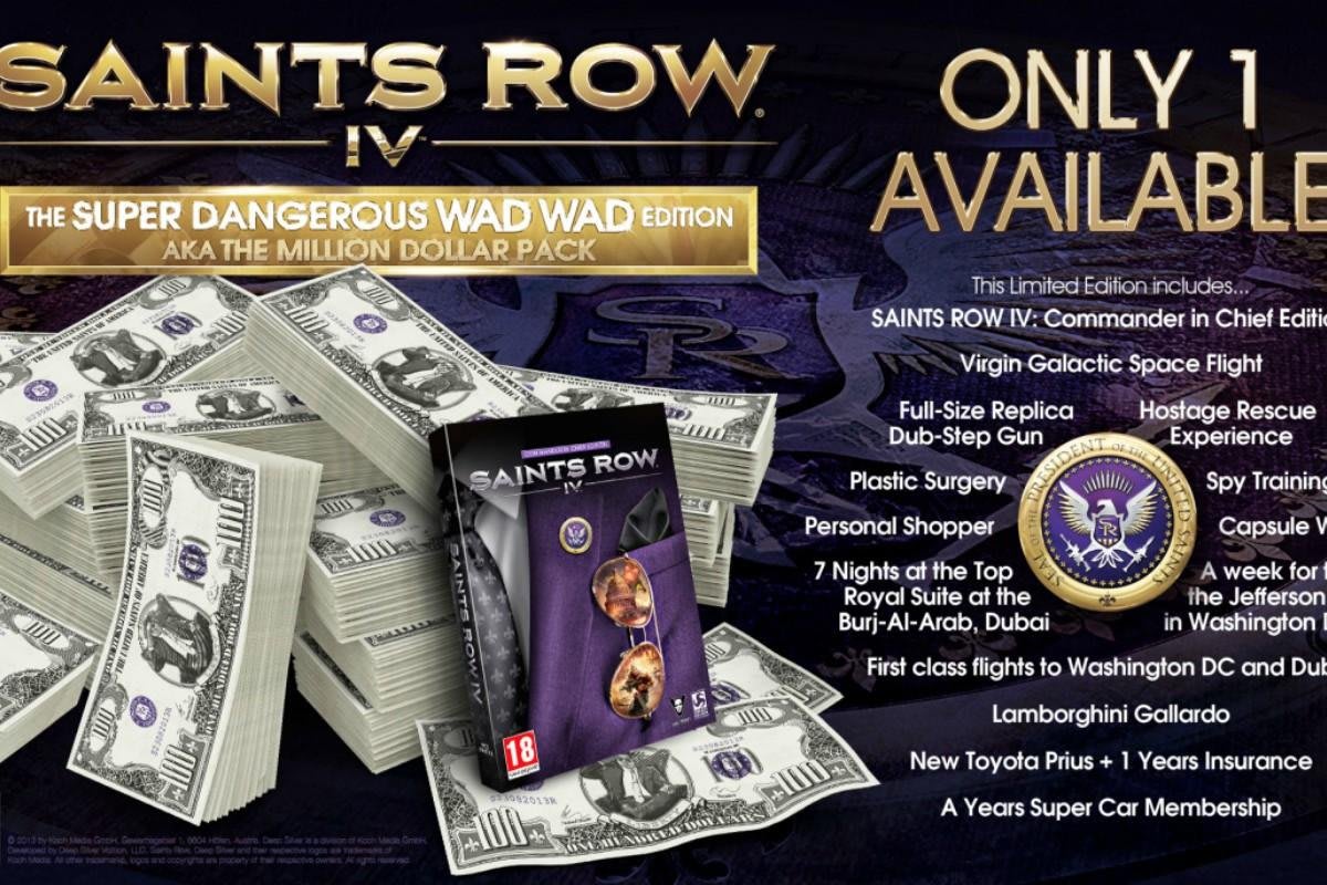 Includes: Saints Row IV: Commander-in-Chief Edition, a spy training day, a holiday in Dubai (plus flights), a holiday in Washington DC (plus flights), a plastic surgery procedure of your choice, a new wardrobe and personal shopper experience, a Lamborghini Gallardo and a Toyota Prius (plus insurance and Supercar membership for 12 months), a hostage rescue experience, a full-size replica Dub-Step Gun and a Virgin Galactic space flight.