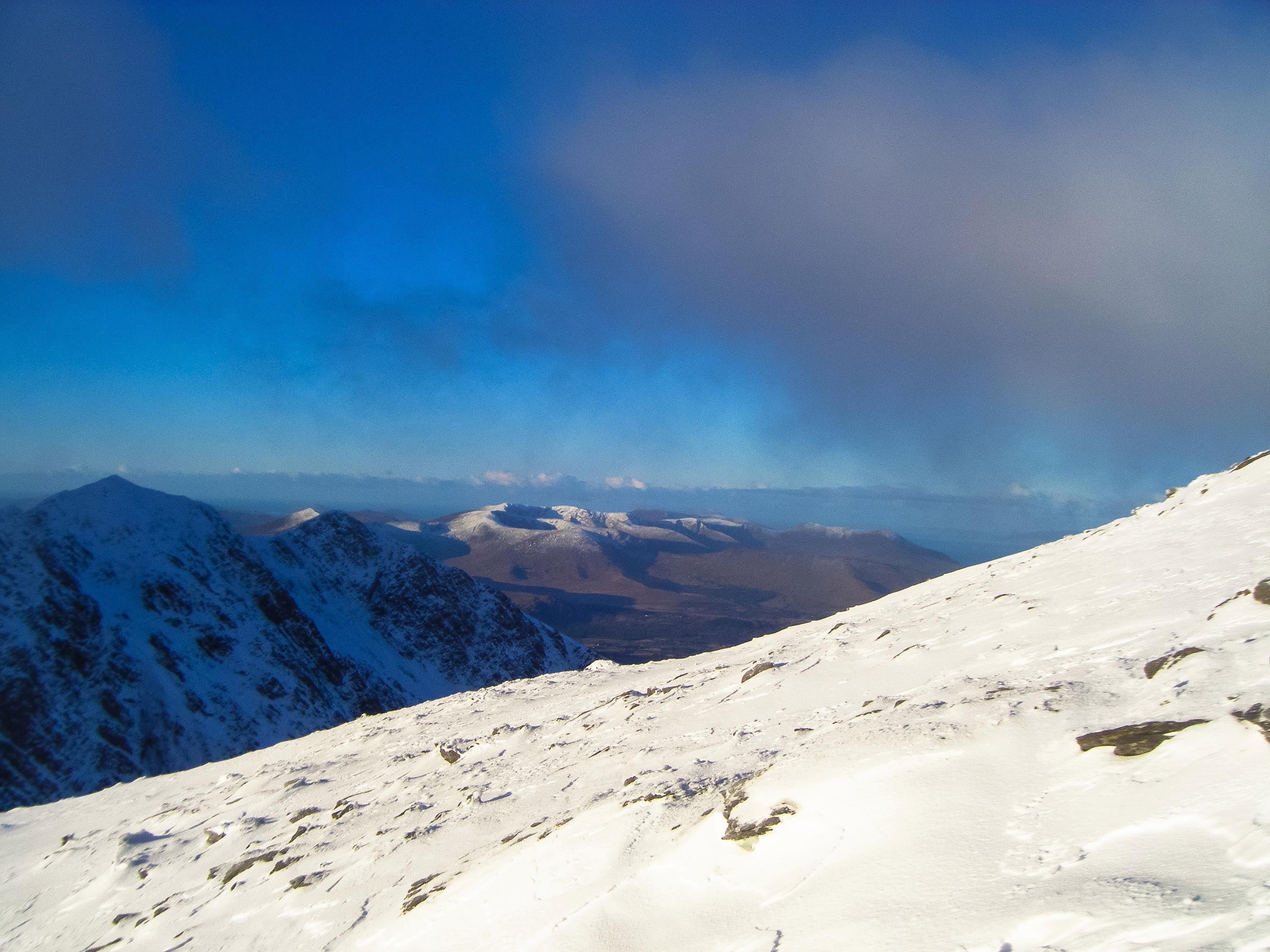 Half way up the gully, my partner and I took a short break. Sitting down in the soft snow beneath me I looked up to the sky for the first time. The sun had reared its head and the sky had begun to transform itself from pitch black to a gorgeous burnt orange. It was as if somebody was adjusting a dimmer switch as different parts of the landscape began to reveal themselves. “Flipping hell,” I thought to myself, “Ireland really is a spectacular place.” This was escapism at its best.