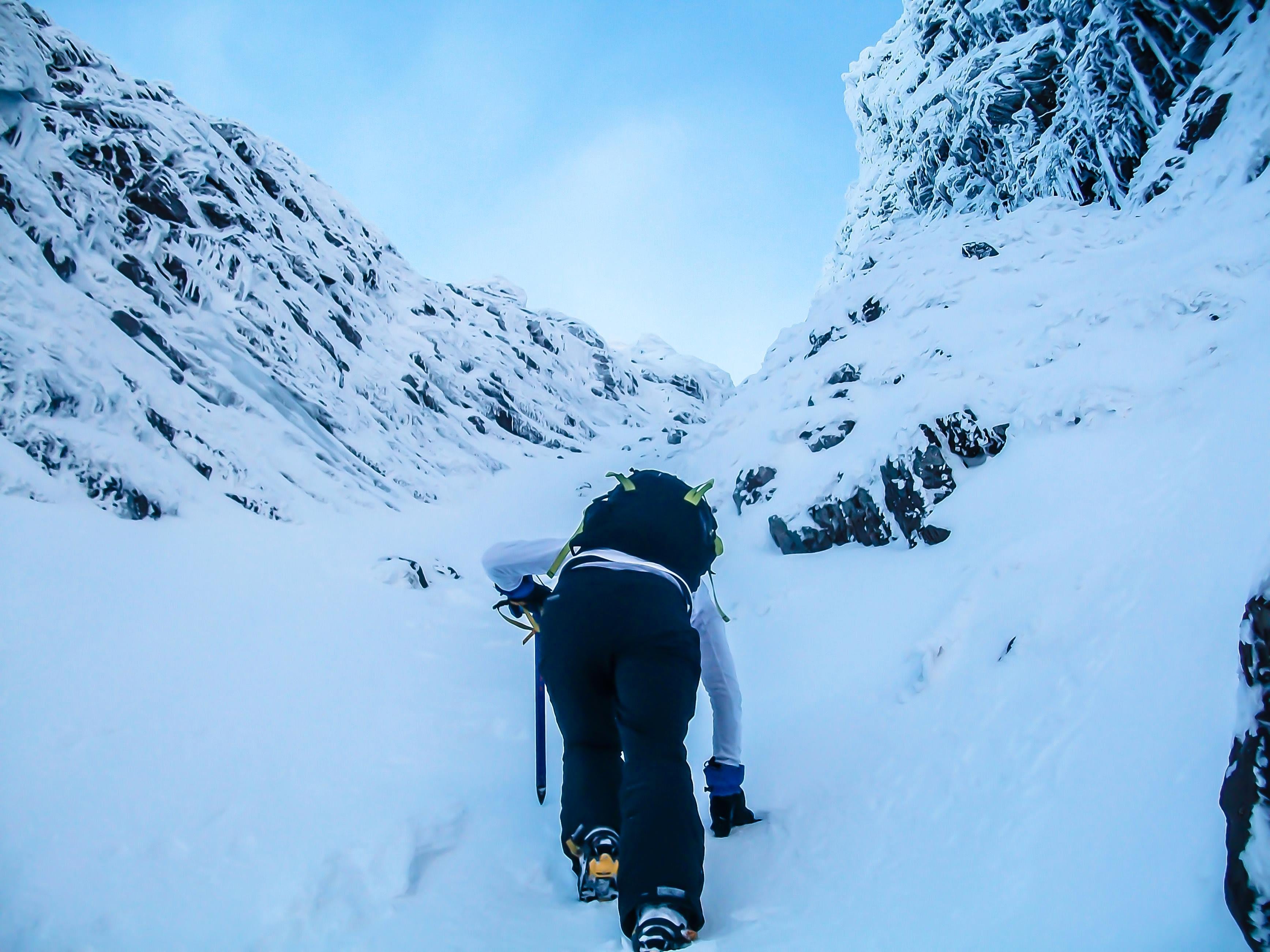 In snow, the climb is considerably tougher than normal and due to position of the gully you can expect deep pockets of snow and sheer ice faces – the ice axe definitely came in handy more than once.
