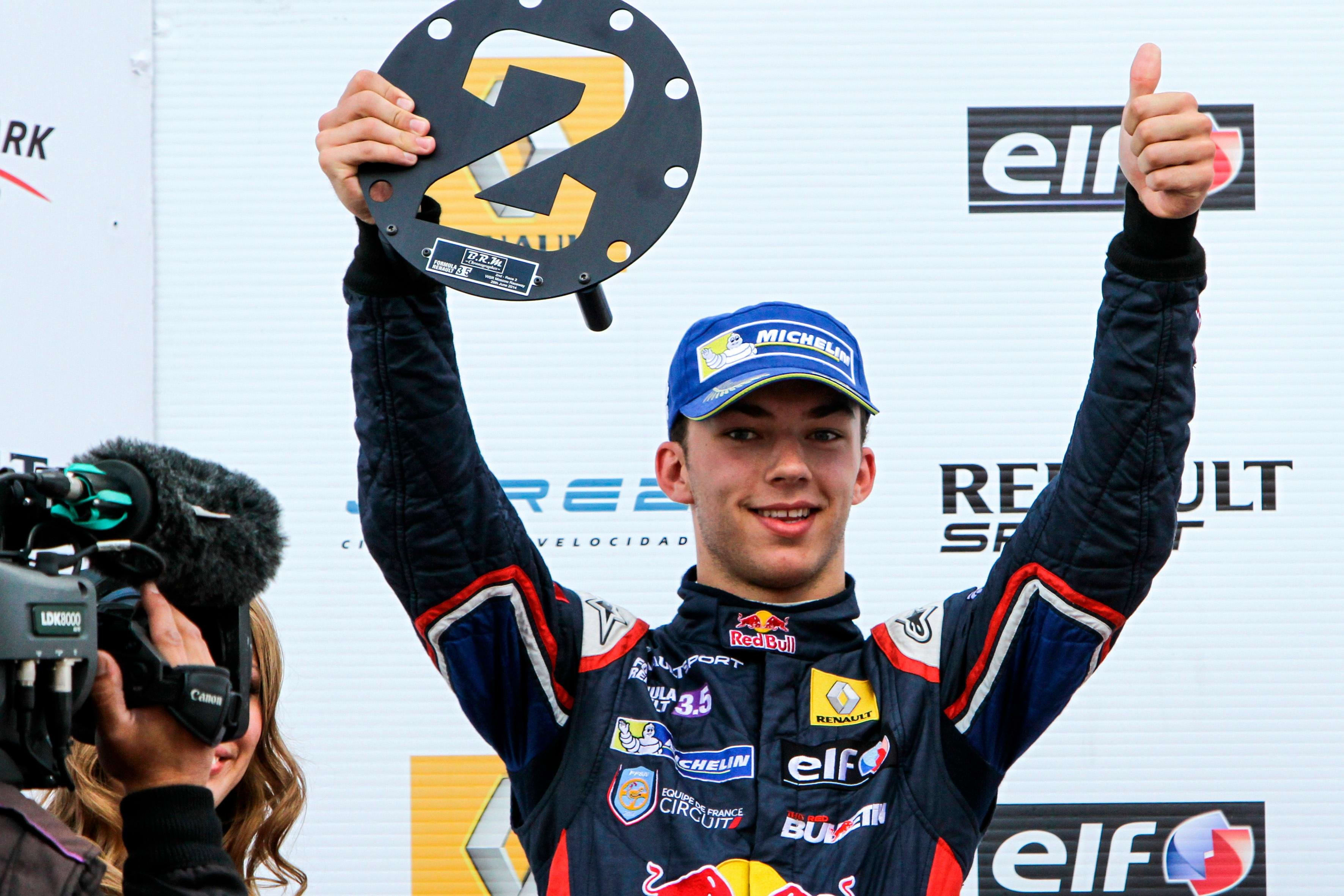 A young Pierre Gasly celebrates a win in the Formula Renault 3.5 Series