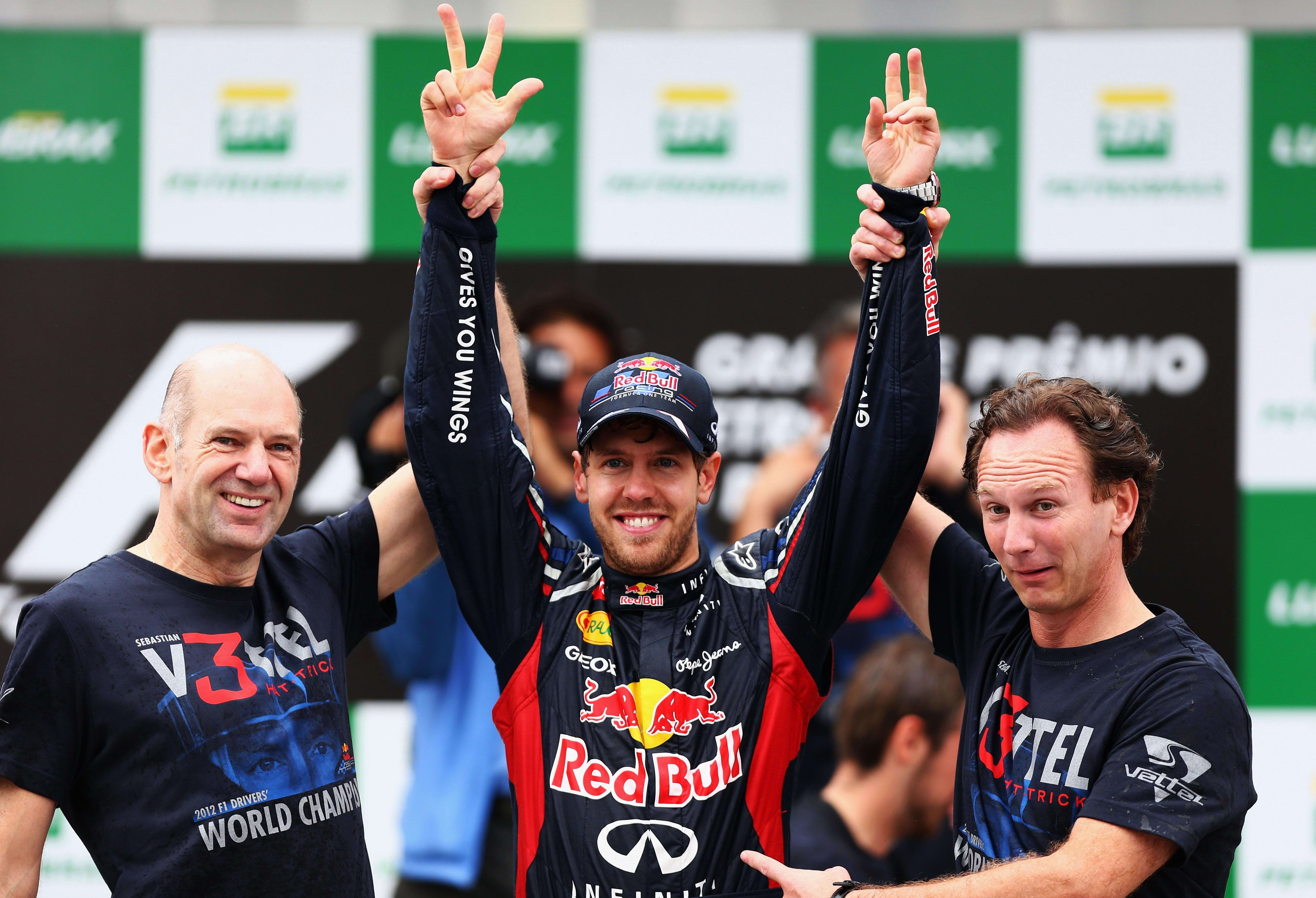 Adrian Newey with Sebastian Vettel and Christian Horner in 2012