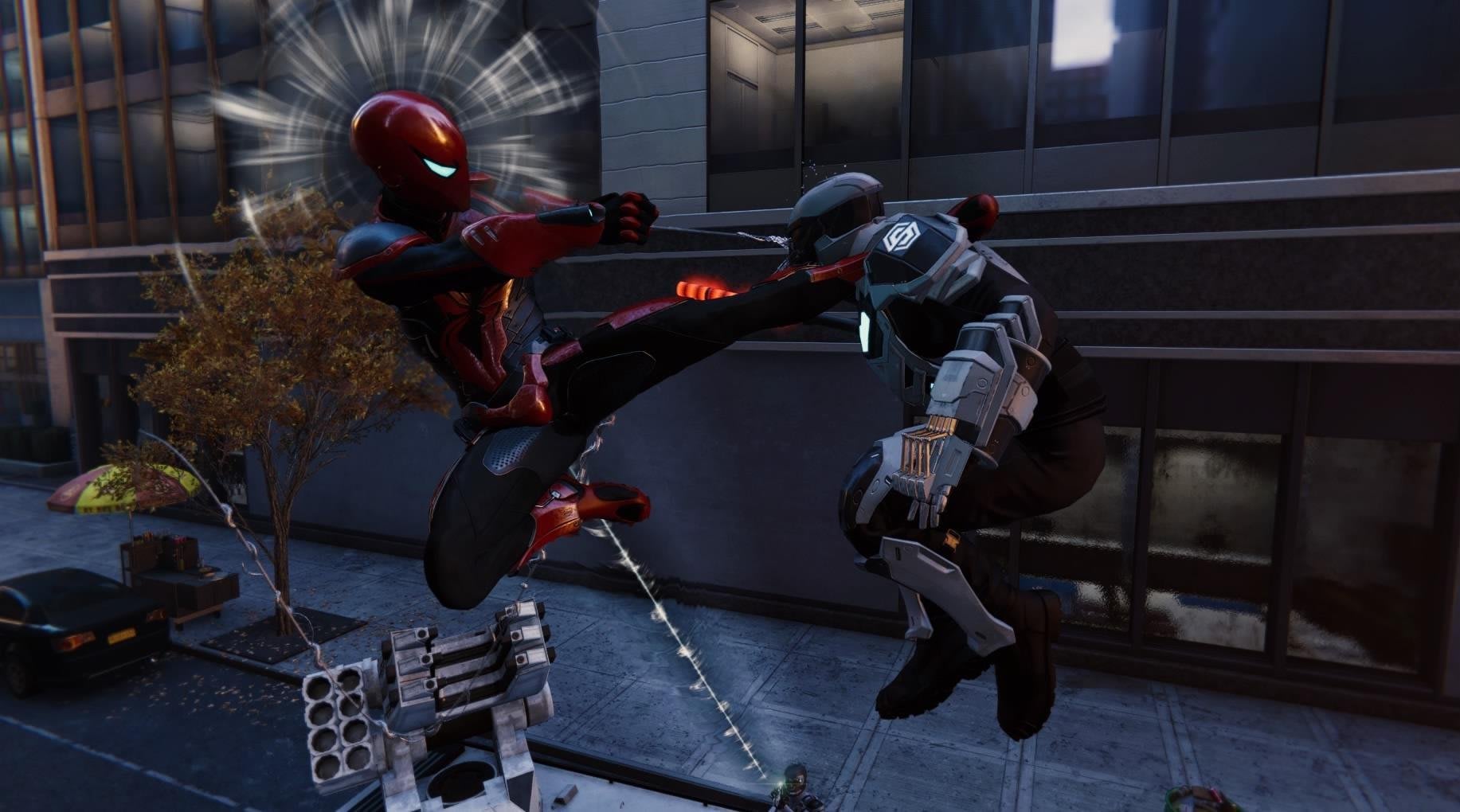 This is the suit you start the game with, and the most famous of all the attire Spider-Man has worn over the years. Right before your battle with Kingpin it’s the one you put on in your apartment, but after the fight it becomes damaged. Thankfully, you can restore it by spending 2 x Backpack Tokens and 2 x Crime Tokens. Its Web Blossom power allows you to fire webbing in all directions, forcing enemies away and sticking them to the wall if you’re near any.