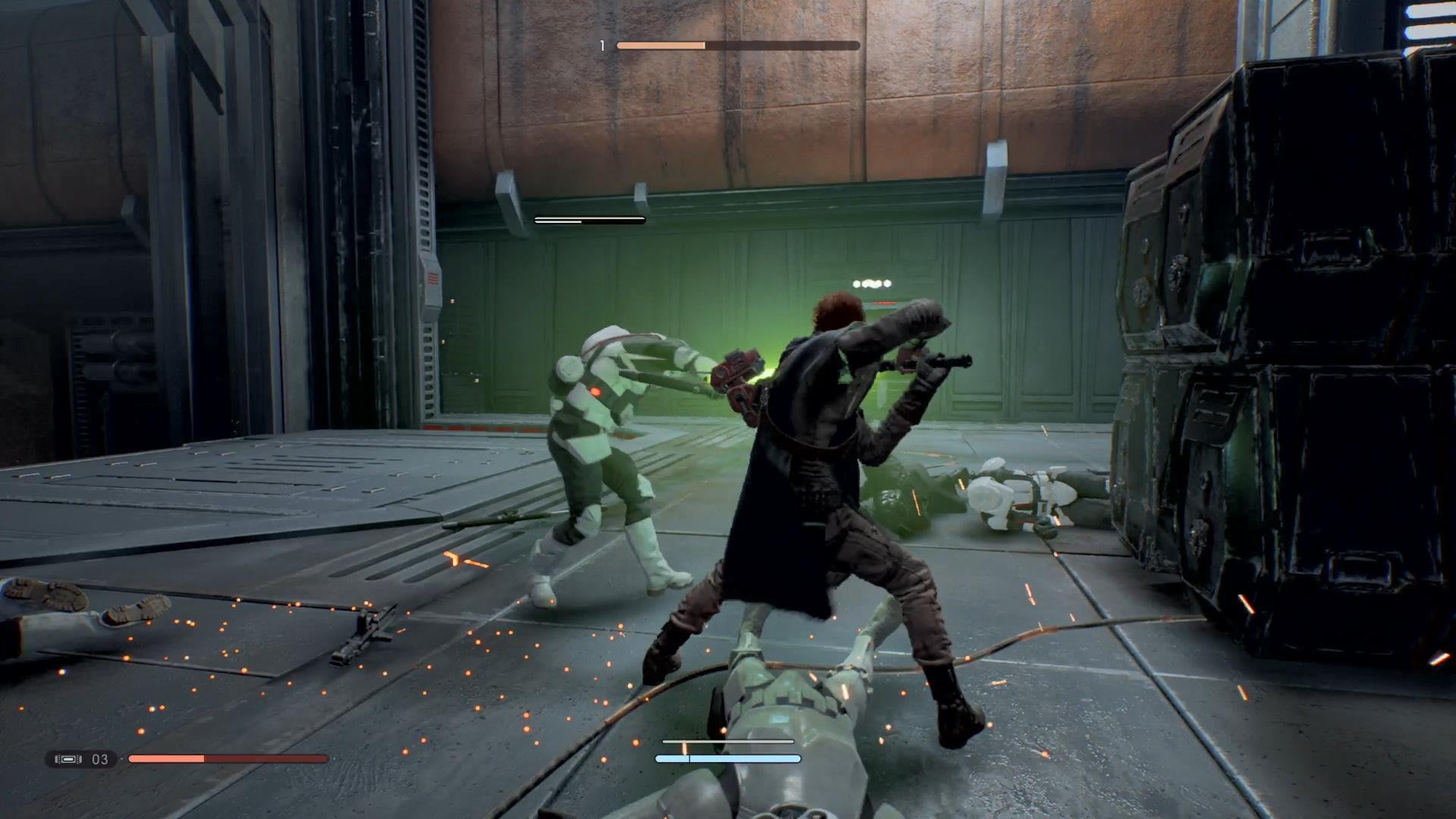 Doing this against blaster attacks can also deflect the shots back at stormtroopers. You’re also able to deflect barrages of blaster attacks. If you walk into a room with several troopers, headed by a commander, they’ll fire upon a signal, and if you parry at just the right time, Cal will use some of that secret Jedi sauce to parry back every single shot, even if you just attempted to parry the first one.