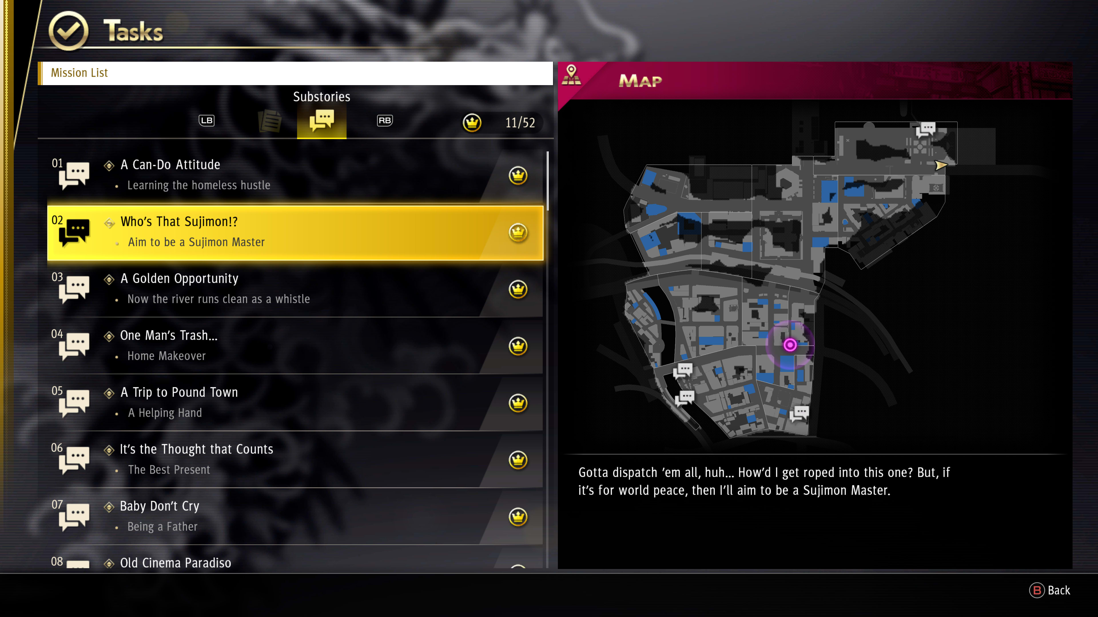 To make it easier to find them, and not miss any, explore the entire map as soon as you're able. Then – when you start each new chapter or open a new Substory – a small dialogue icon will appear on the map. You should usually be able to Taxi to close by, too, if you followed the last step in this guide.