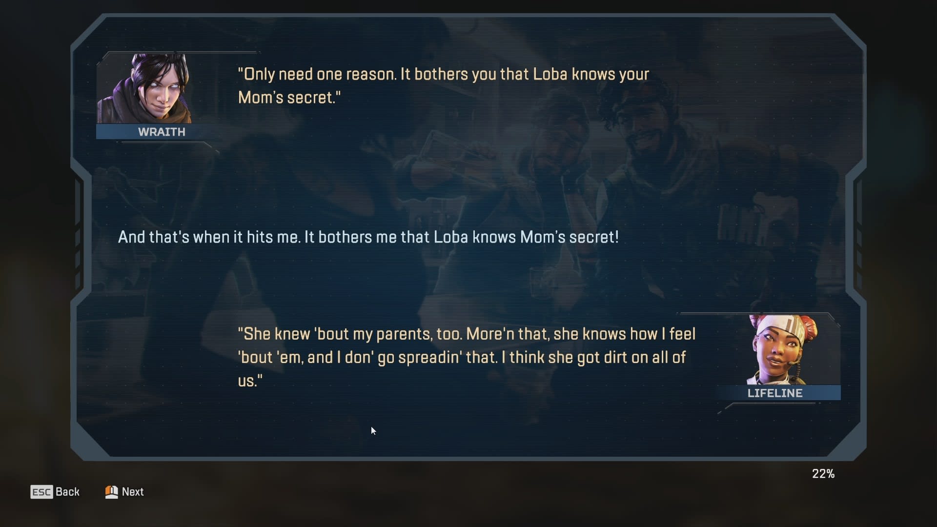 The story involved the Legends discussing what they did, and what the next step is going forward. These are lovely little pieces of story that both build the narrative that Respawn is building for this season, as well and giving each legend more character, whether it’s Bangalore’s no-nonsense mindset, Mirage’s daydreamy lack of focus, or Octane’s complete obliviousness, each Legend gets a little deeper with every quest completed.