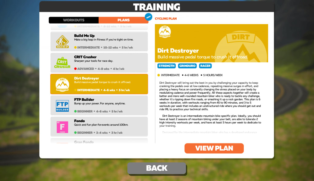 Have you got a fitness goal? Then there’s probably a pre-built training session on Zwift that will help you smash it. You can browse the whole 650-plus library of sessions and read their descriptions to pick which session will help you improve. From building your base fitness, boosting your sprint, and developing climbing power, there are tonnes of sessions to choose from. Not only that, but Zwift has a couple of mountain bike-specific training plans (Dirt Destroyer, a 6-week plan aimed at intermediate riders; Singletrack Slayer, a 10-week plan aimed at advanced riders) to help you rip on the trails. You can even make sure your avatar is riding a mountain bike for the sessions!